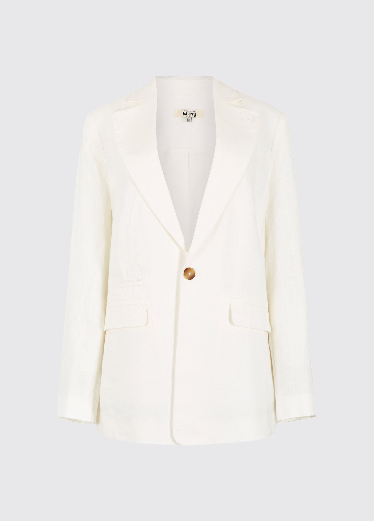 A sophisticated addition to you wardrobe, our Avonlea tailored linen jacket will elevate your summer style in an instant. The one button design with a relaxed shape can be worn with matching Dubarry Maryland shorts or simply teamed with jeans, tailored trousers or dresses of your choice. Expertly tailored in Portugal the 100% European linen is cool and breathable, ideal for smart summer invitations and evening cocktails