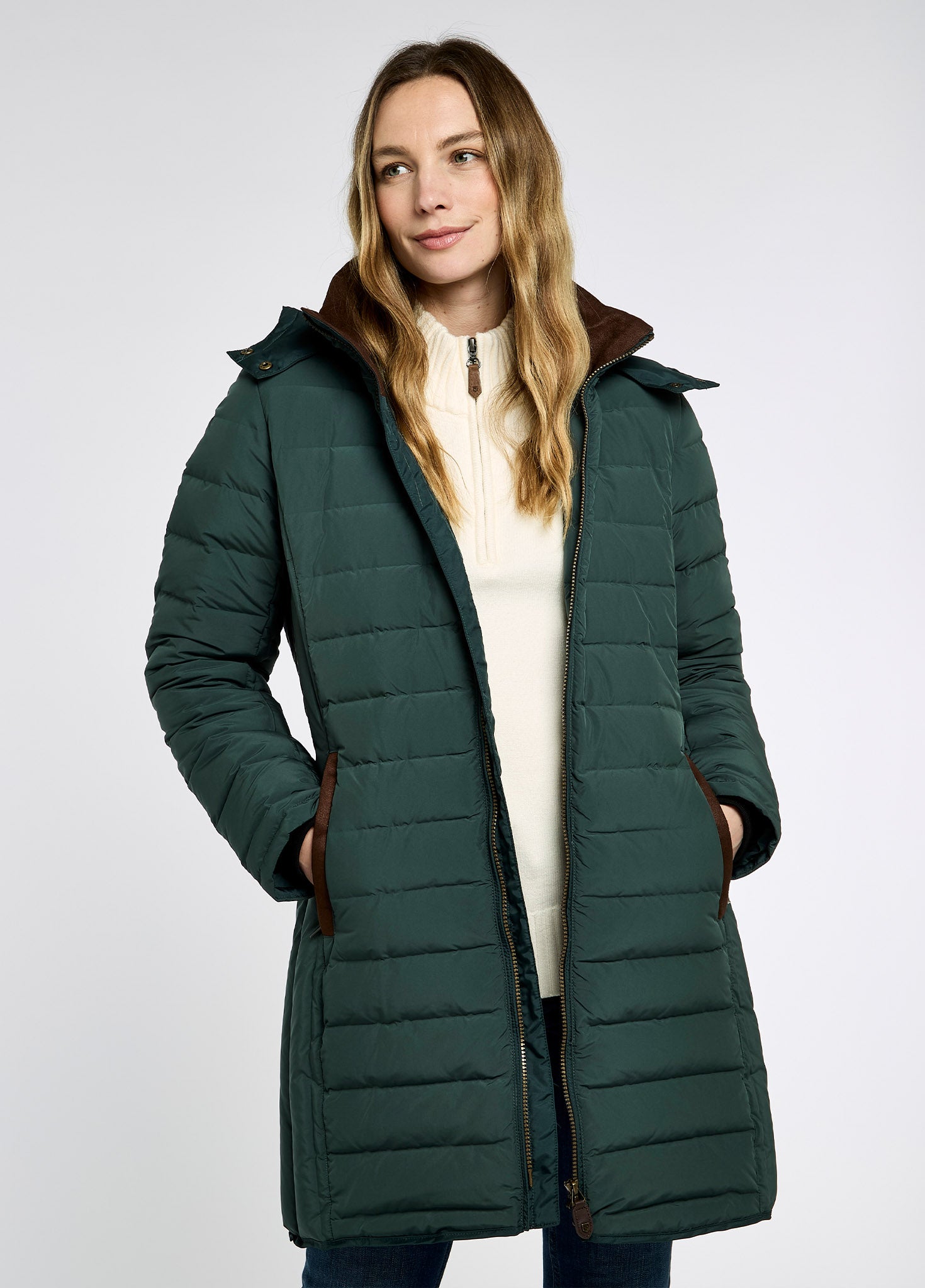 Hunker down in the Ballybrophy three-quarter length coat for serious seasonal warmth. Filled with ethically sourced 90% down and 10% feather, it has a handwarmer pockets, a detachable hood and a full-length two-way zip, making a snuggly, winter weather beater ideal for weekend errands and walks with the dog. Match with some Dubarry country boots for head-to-toe toastiness.