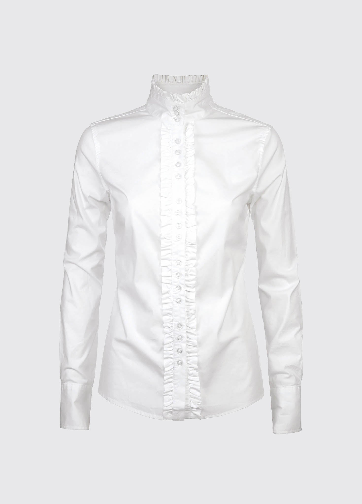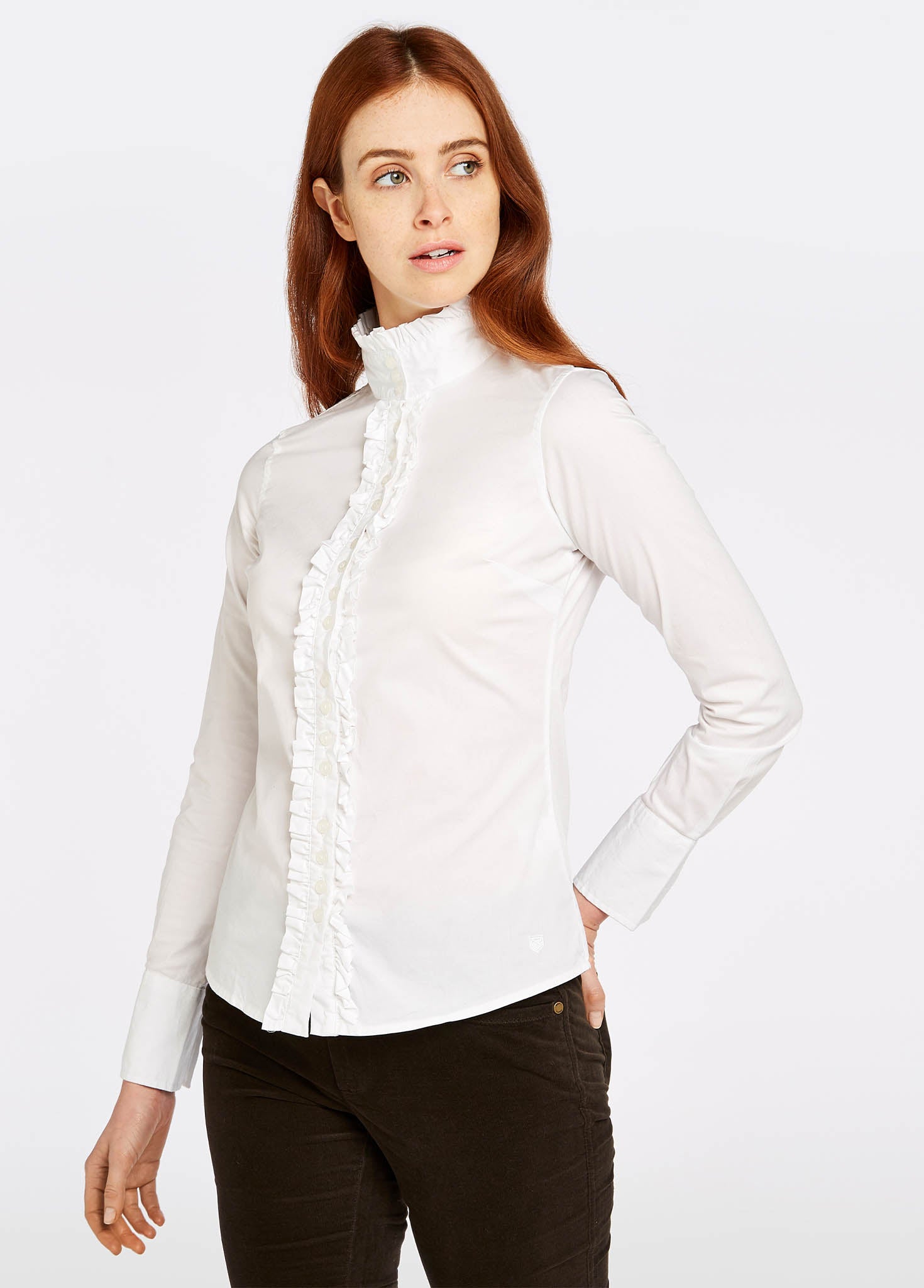 A traditionally inspired shirt, the Chamomile has an elegant style. Ruffle detail along the button fastening runs the full length up to and around the edge of the stand up collar. Team it with Dubarry tweed for a timeless country style or match with skinny jeans, Chelsea boots and a leather jacket for a modern twist.