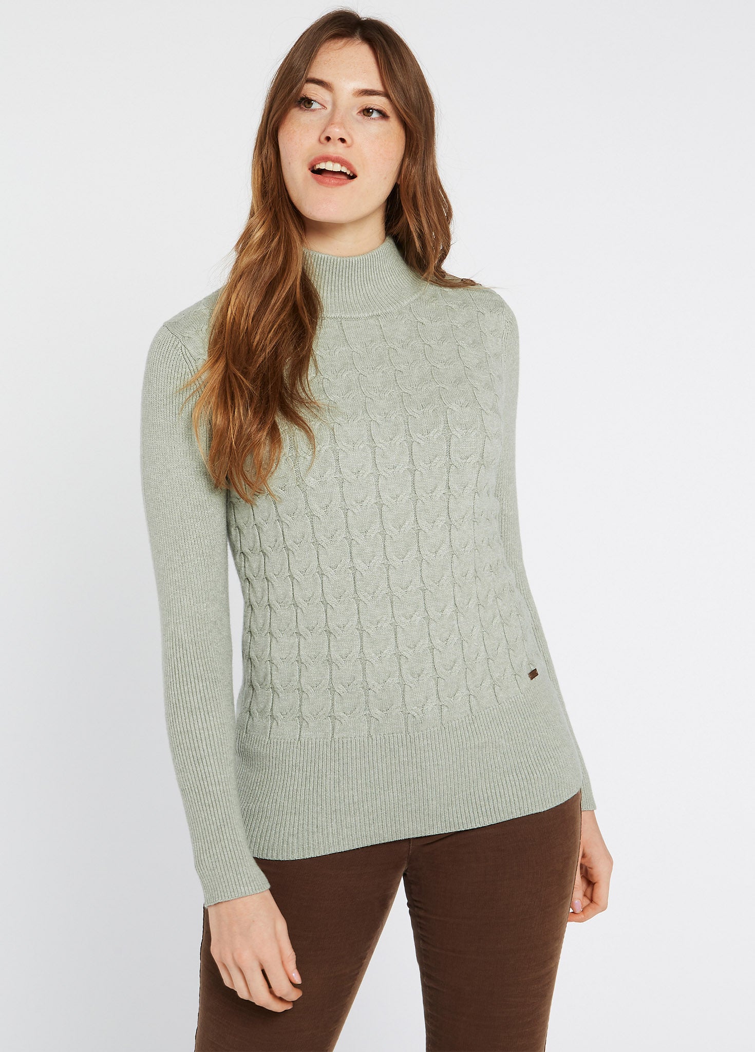 Claremont women’s cable stitch sweater with mock neck in Sage