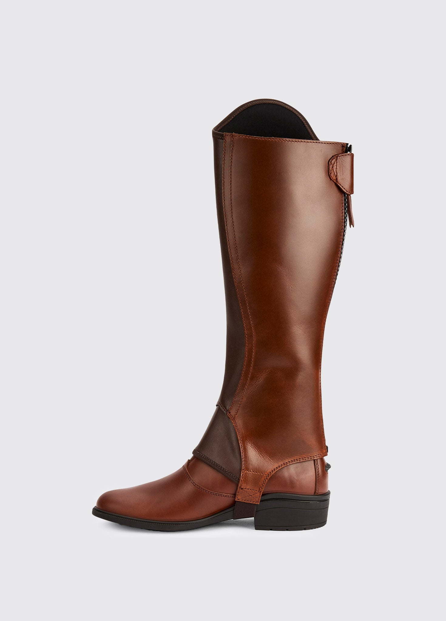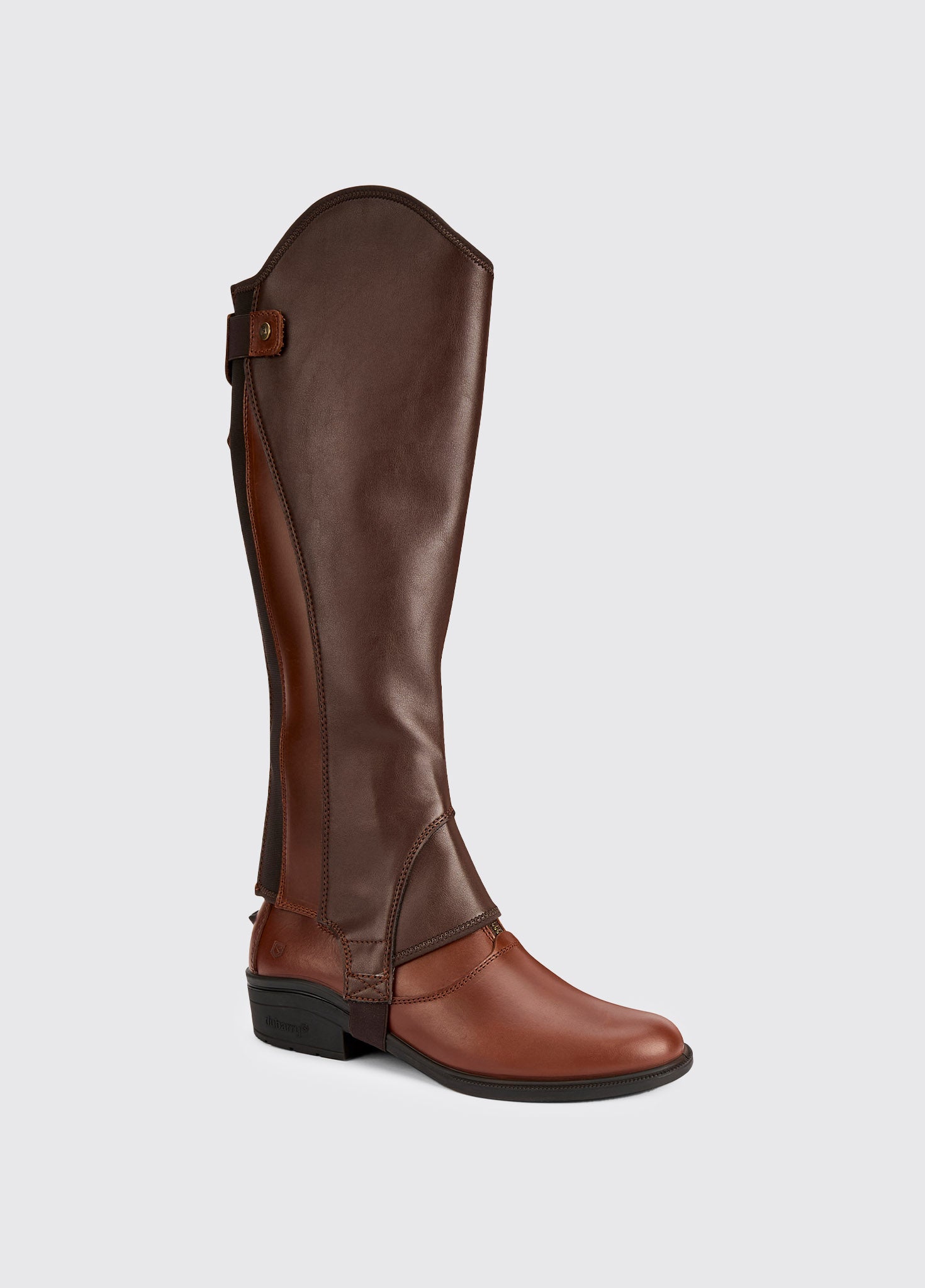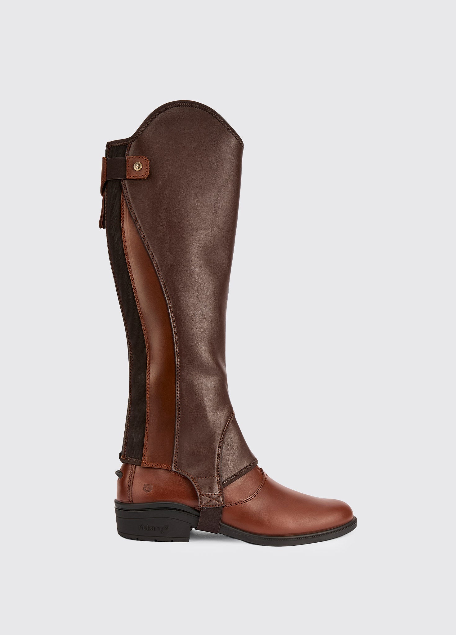 The Dubarry half chaps are made with the highest quality full grain leather, incorporating a full-length lateral stretch panel for a snug fit and an elasticated stirrup to pair perfectly with the Punchestown paddock boot.