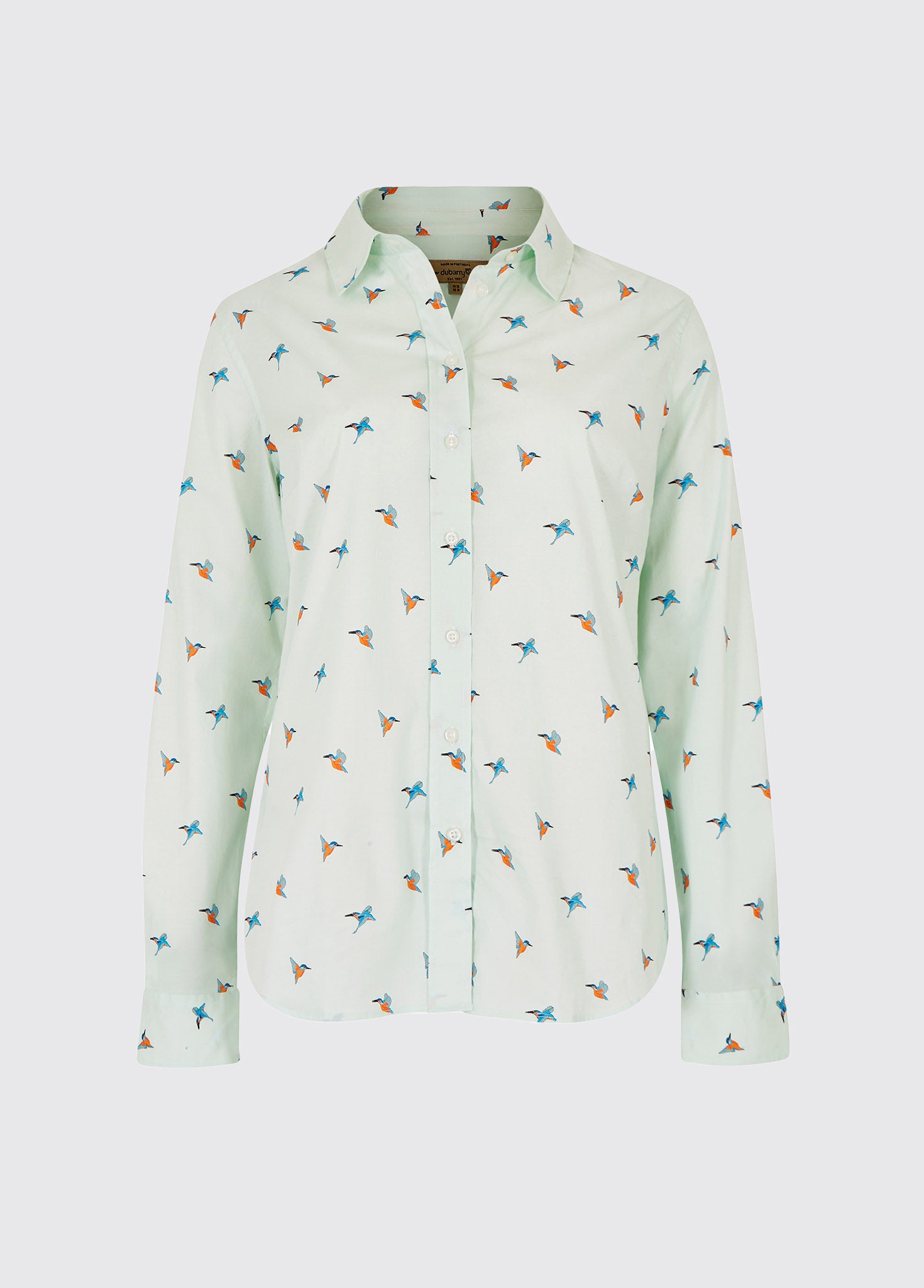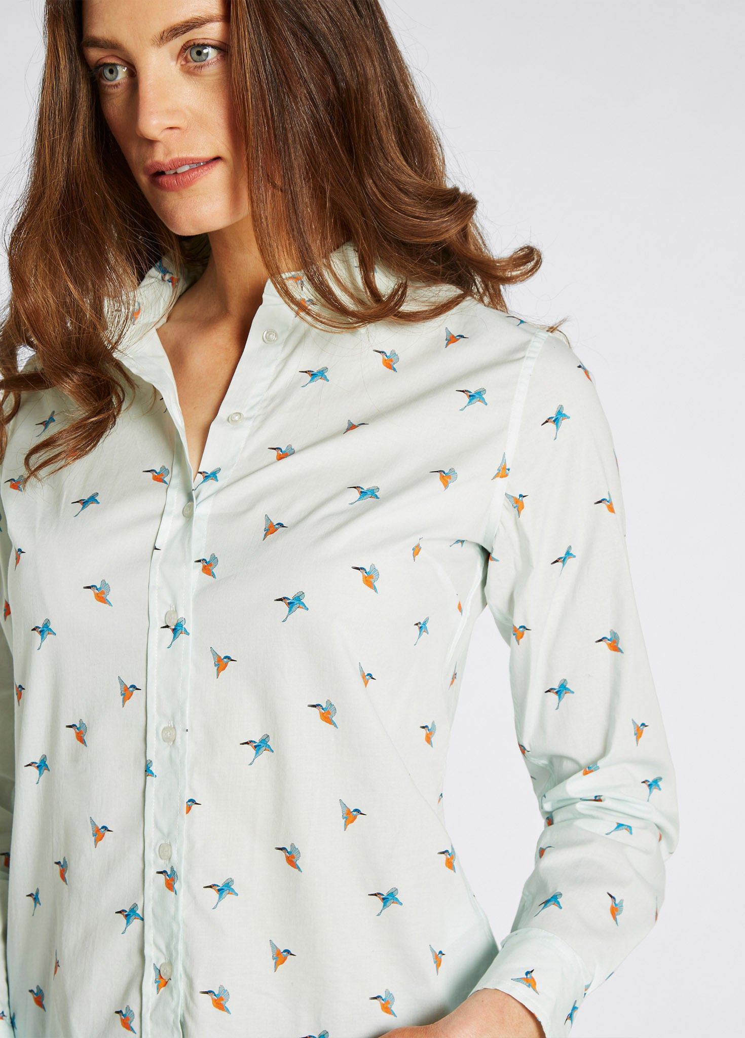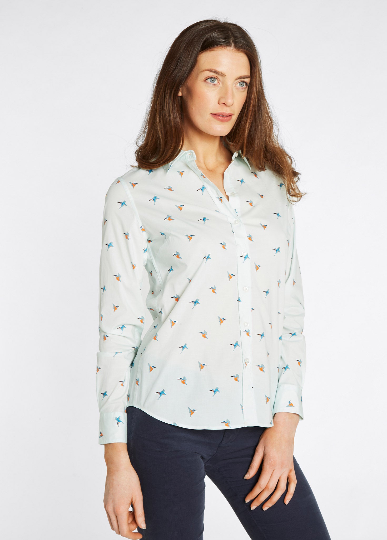 Firefly ladies shirt is inspired by our rural heiritage and designed with a curved hem and back darts for comfort while maintaining a pleasant silhoute. Kingfisher custom print is unique to Dubarry.