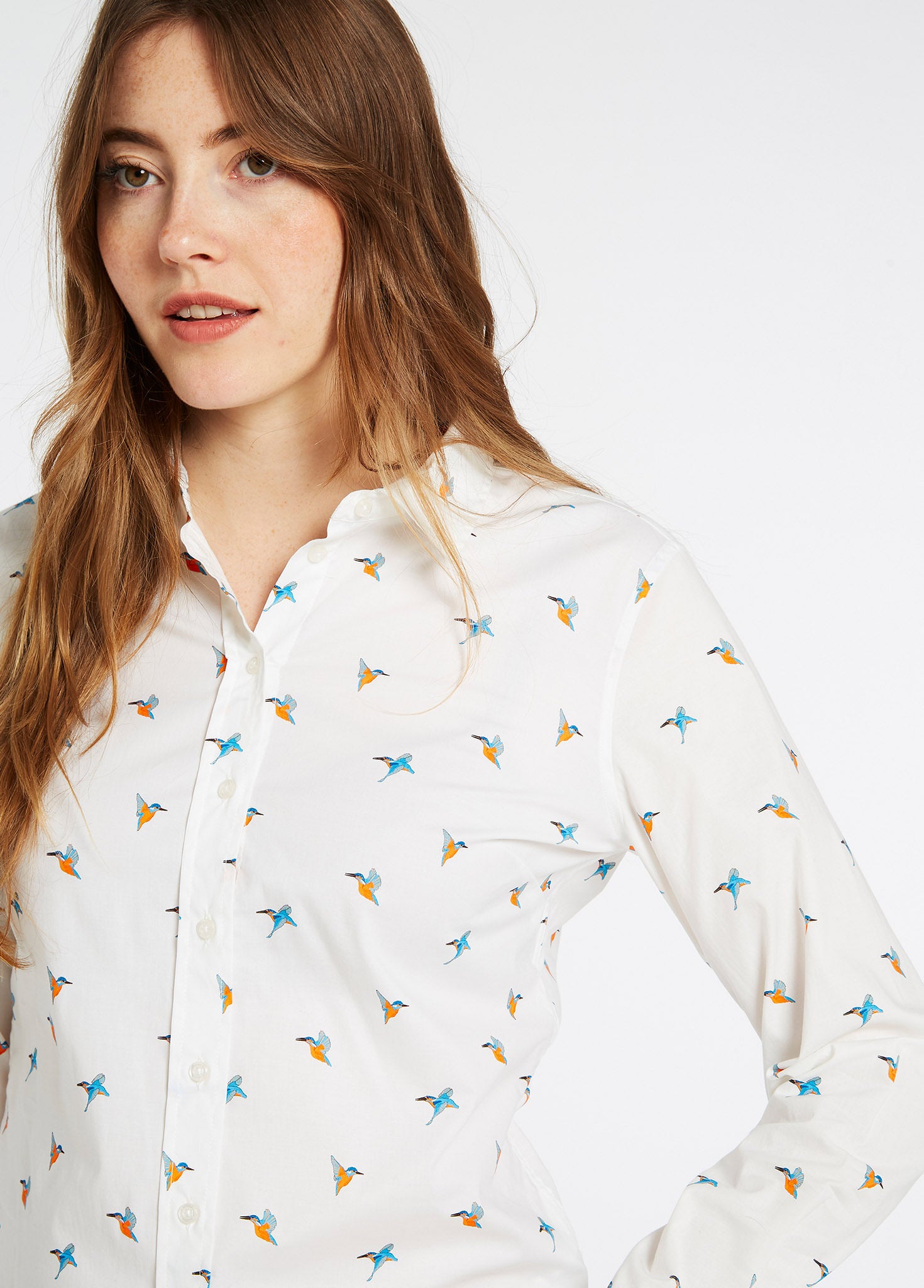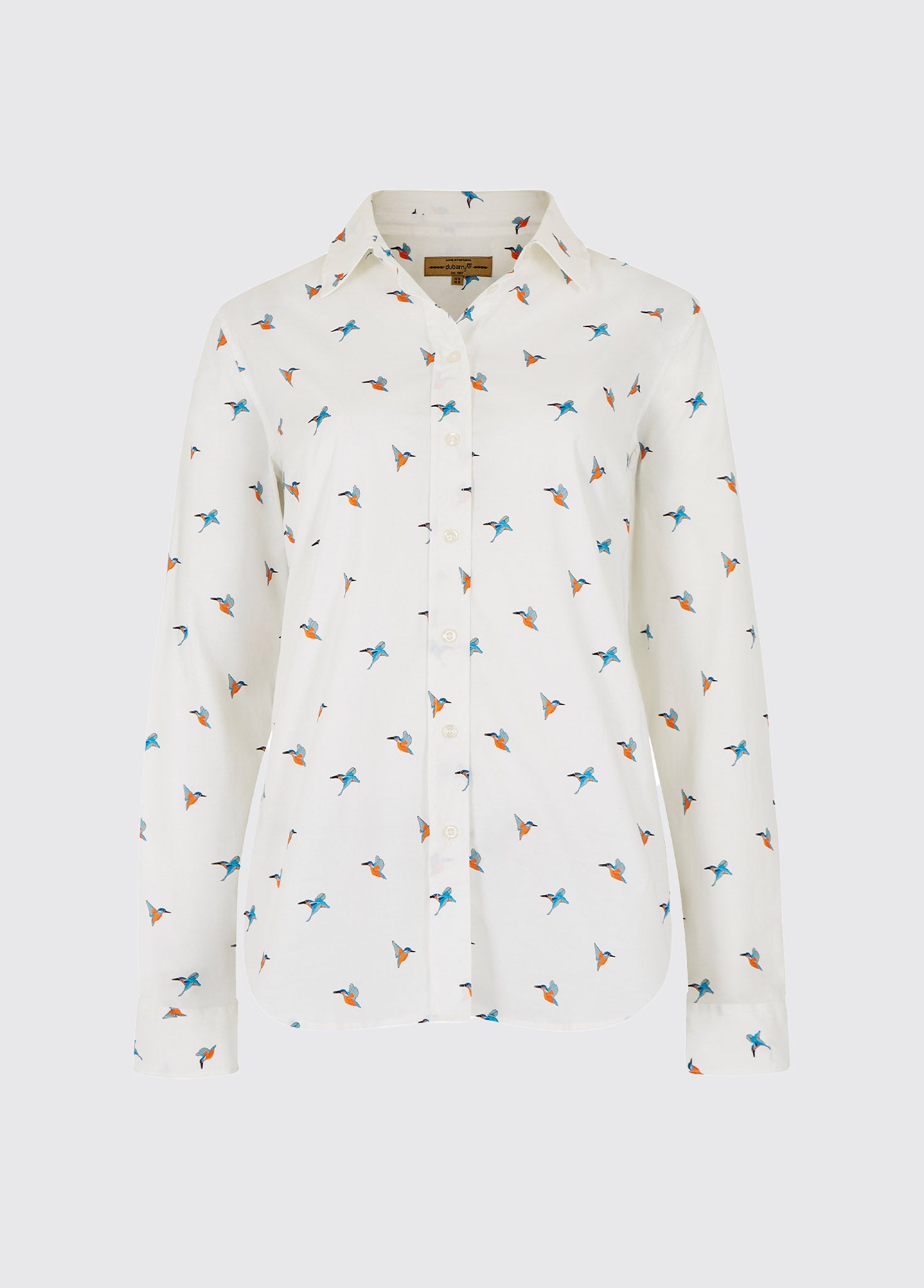 Firefly ladies shirt is inspired by our rural heritage and designed with a curved hem and back darts for comfort while maintaining a pleasant silhoute. Kingfisher custom print is unique to Dubarry.