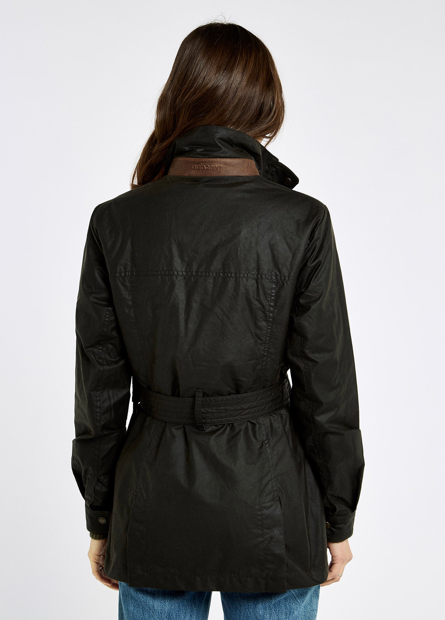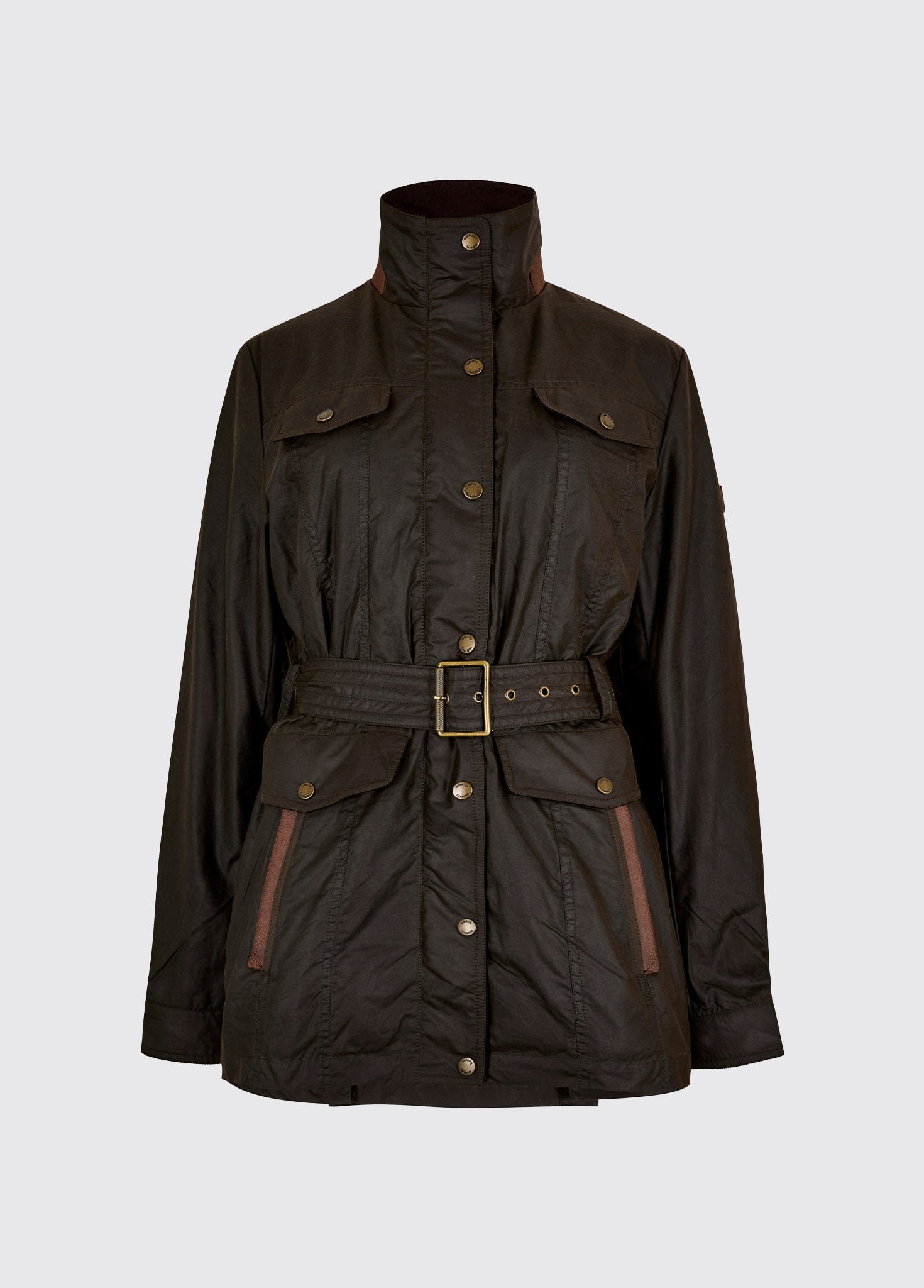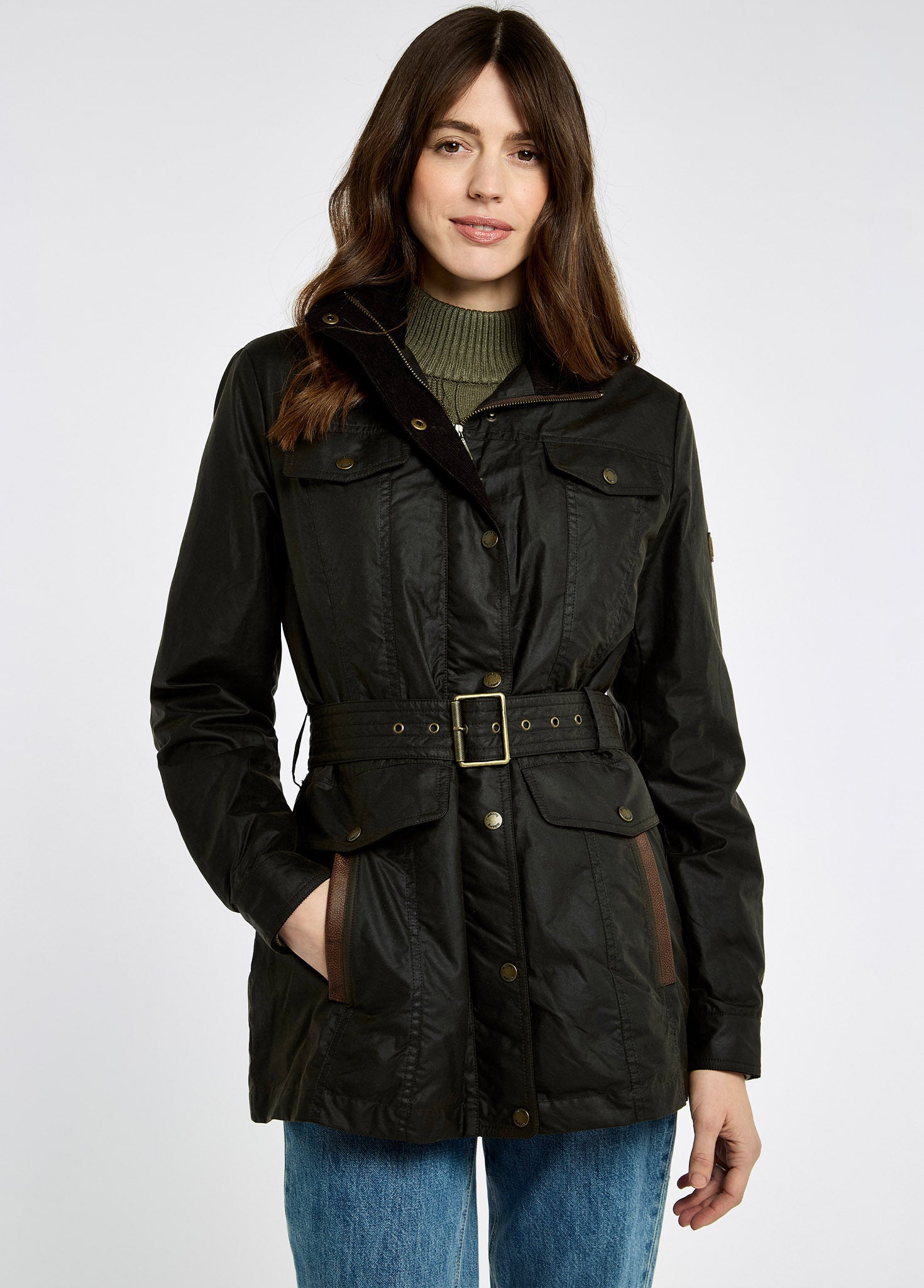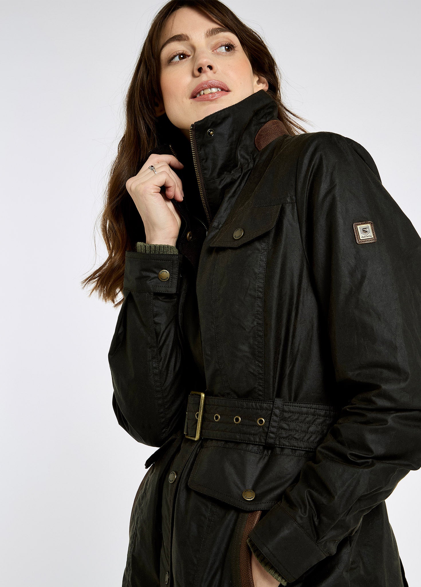 This densely woven wax cotton coat with a silkwax finish brings comfort and tailoring to a classic style. With multiple pockets and a belted design, it has a utility feel but real leather trims and panelled sherpa lining adds a contemporary, luxury tone. Dress with tonal corduroy jeans or denim and Dubarry boots for a casual yet chic autumn weekend ensemble.