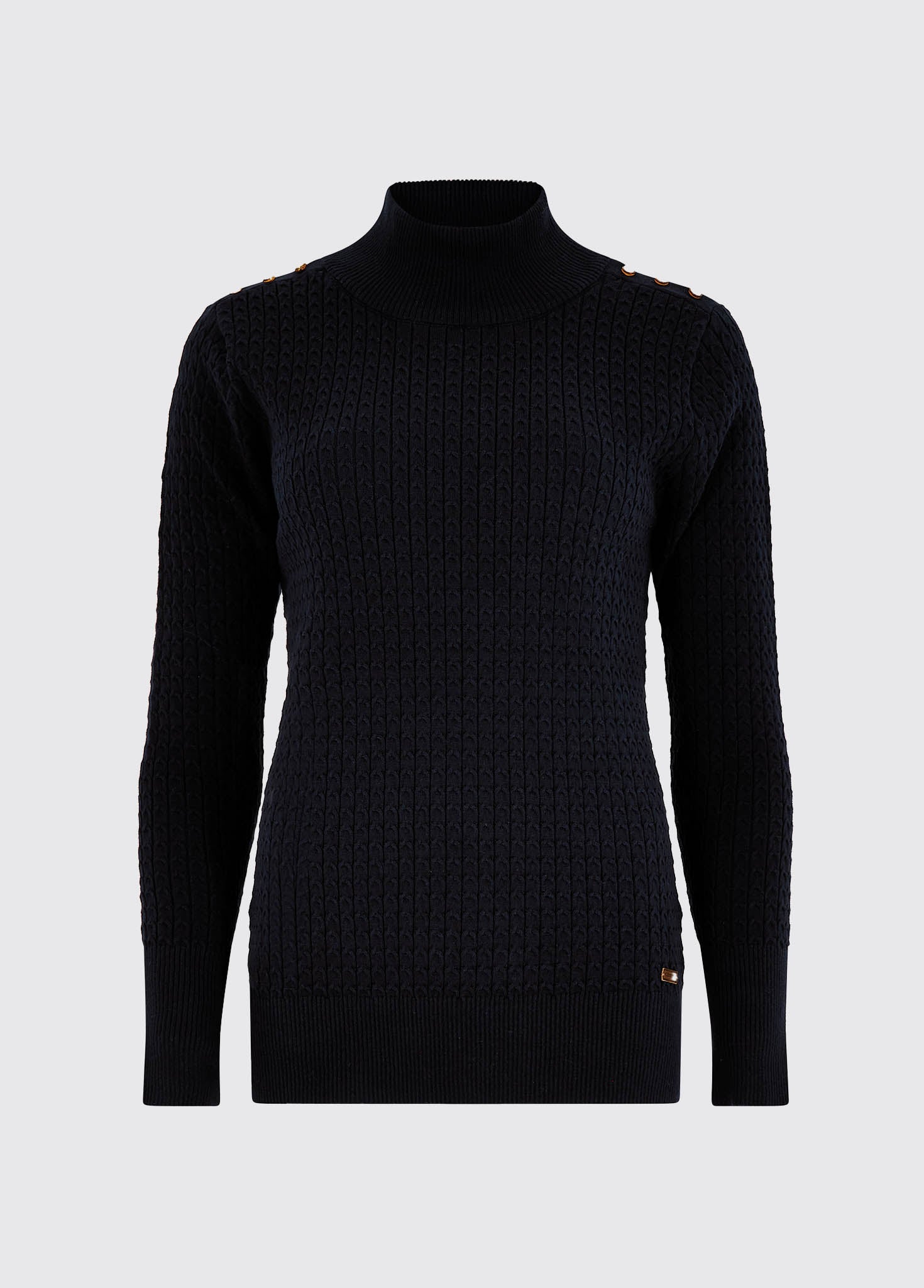 A real capsule piece, our Monkstown sweater has fantastic versatility as well as super soft comfort. An intricate cable stich pattern gives a real touch of class, finished with pearl buttons on each shoulder. Elevate your weekend style by matching with your favourite jeans and Chelsea boots or team with a Dubarry tweed skirt and long length boots for a professional touch