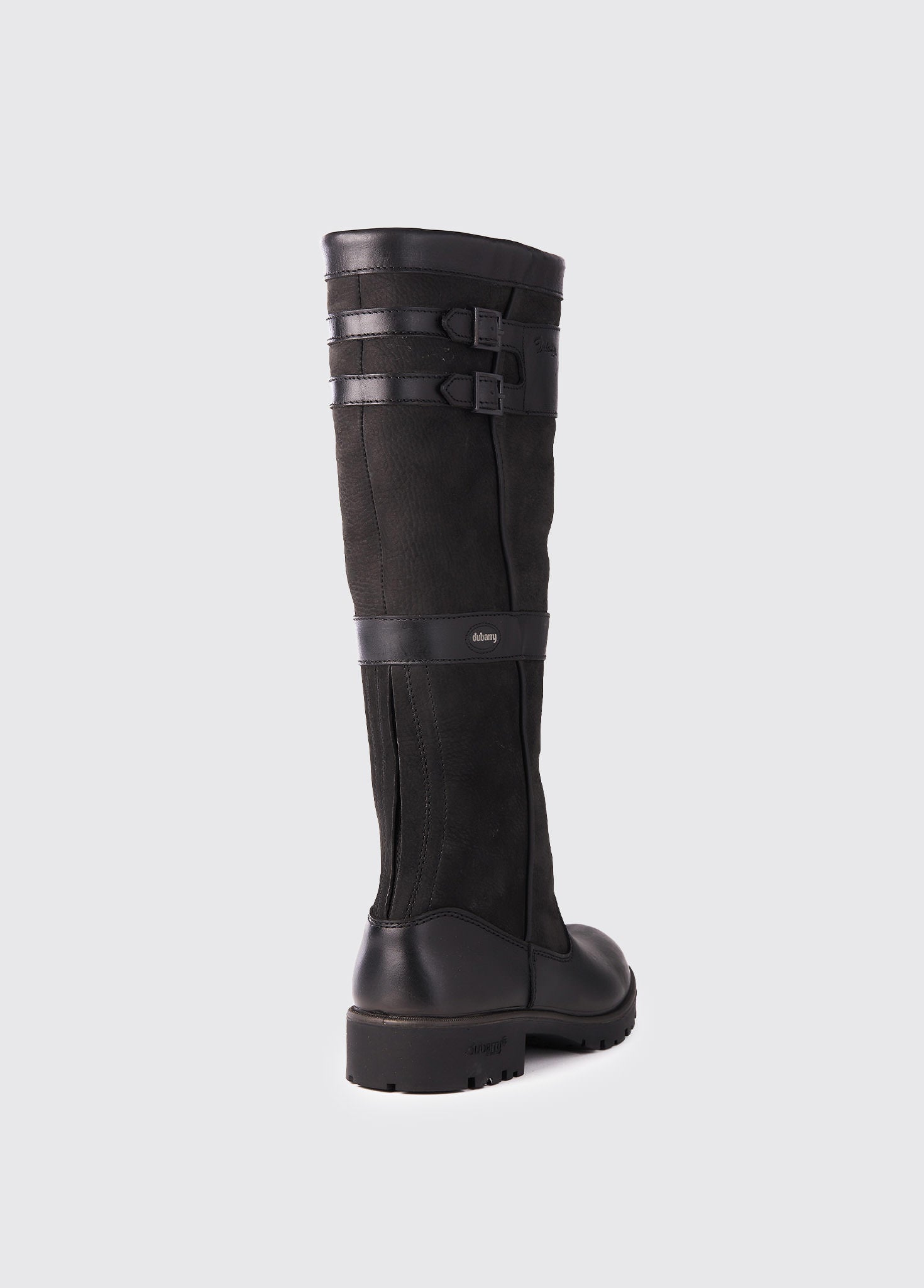 Pair of Dubarry Longford country boot, knee high black leather heeled boots with buckles