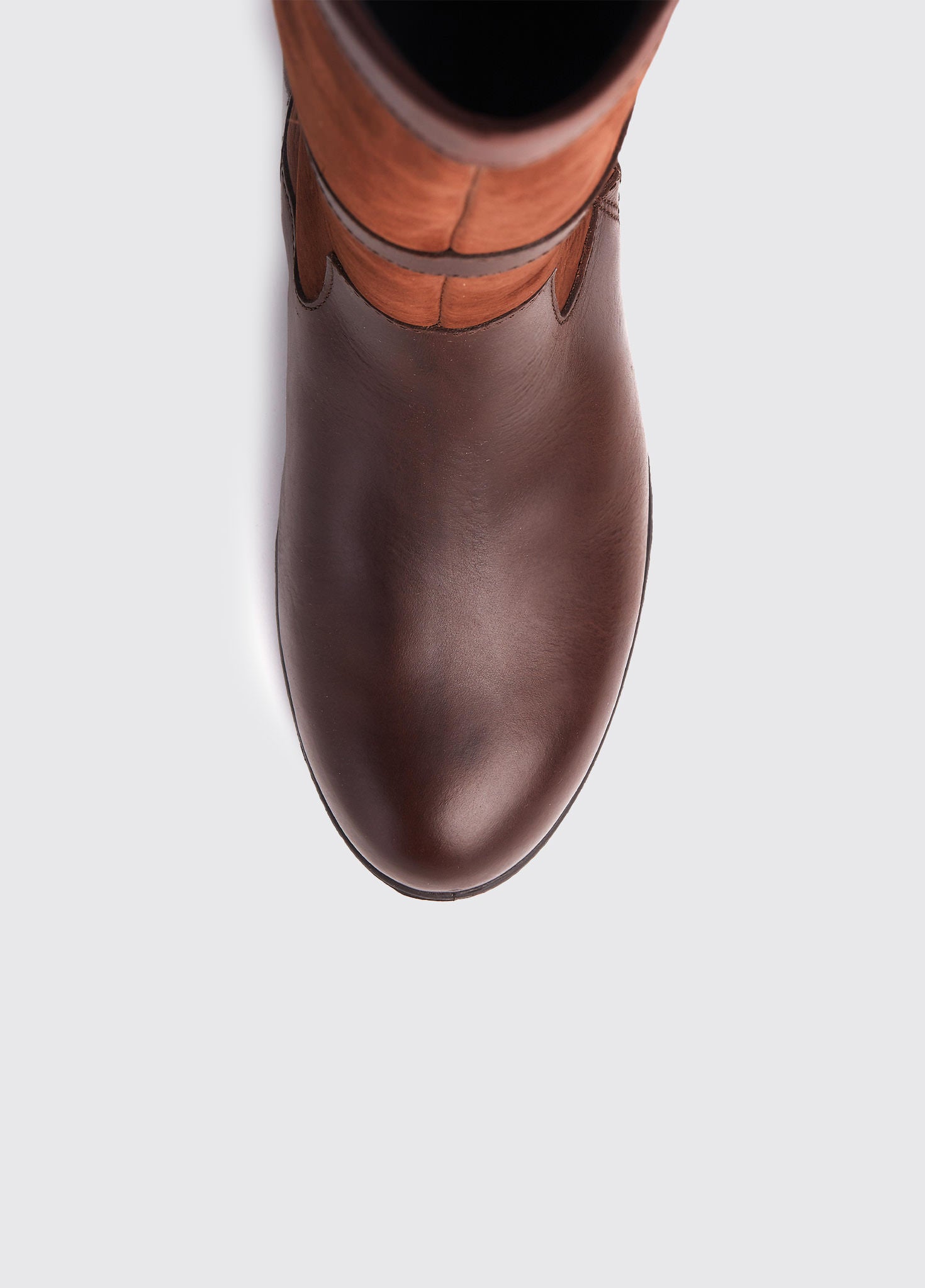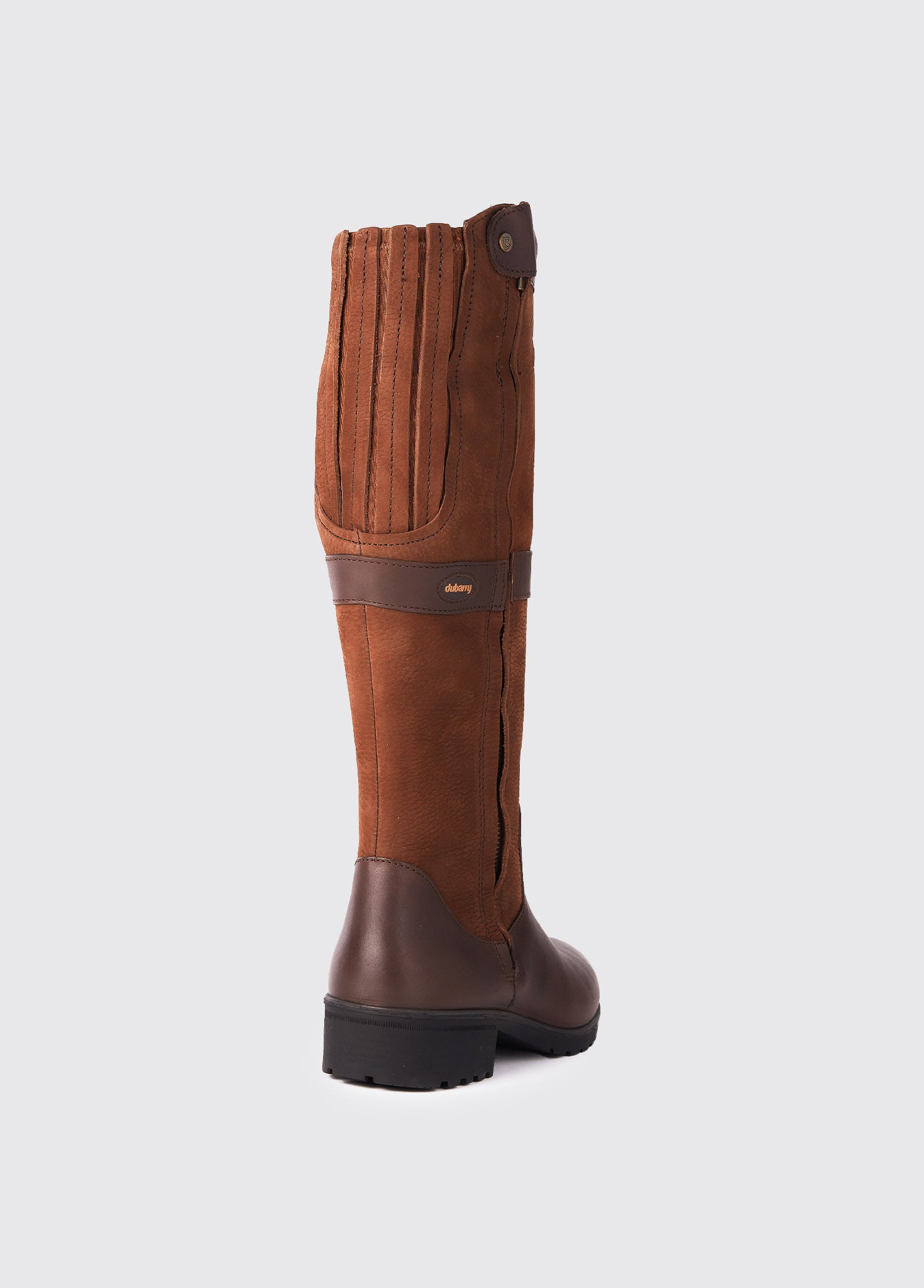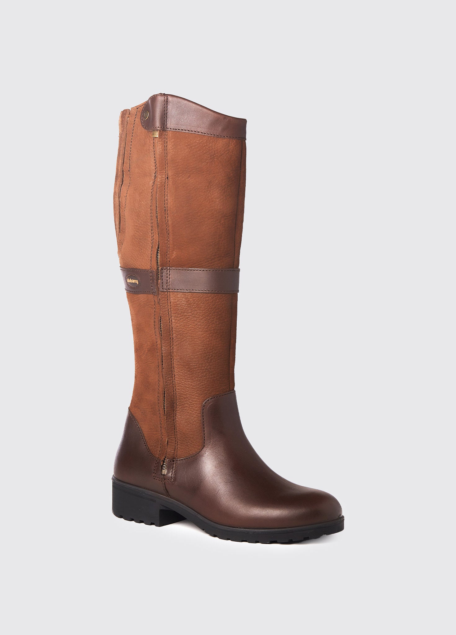 The Sligo knee-high boot for women is packed with all the technical features you'd expect from a Dubarry country boot. GORE-TEX lining and Dubarry's signature DryFast-DrySoft™ leather plus a securely bonded sole all creates a waterproof, shock-absorbing, comfortable boot. A full length zip helps foot entry and a leather covered elasticated calf panel streamlines the calf giving an elegant silhouette. Built to withstand the rough and tumble of country life, the Sligo style and fit looks great in a more urban setting too.