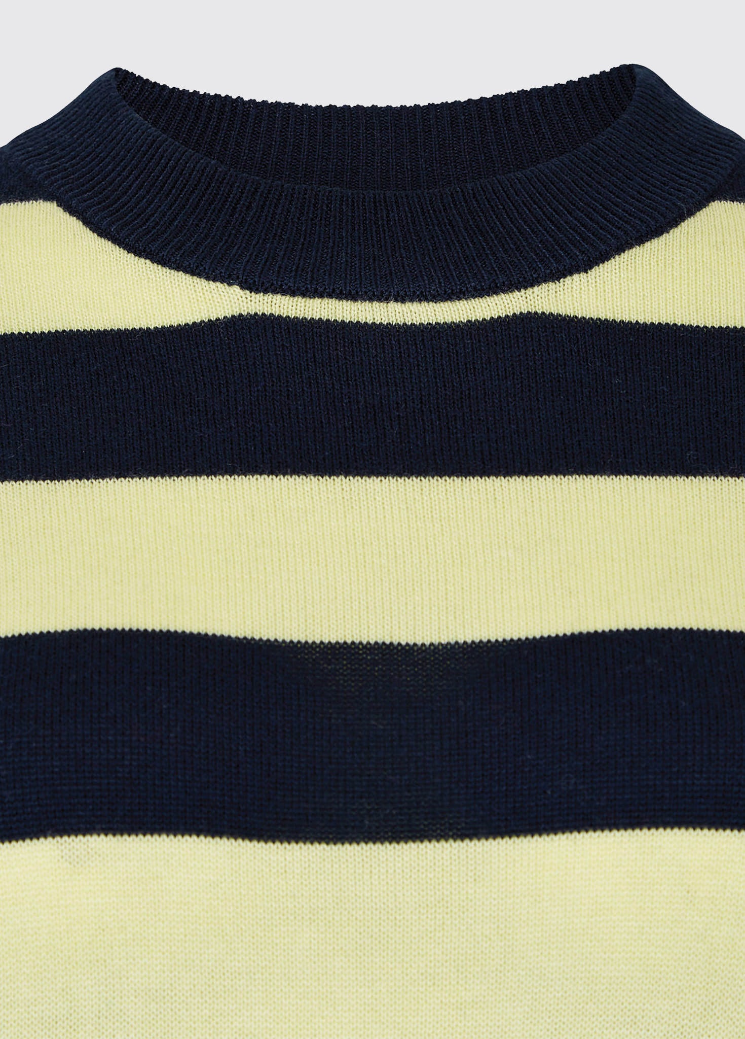 Big, bold Breton-esque stripes team with the softest of bamboo and cashmere fabric in this perfect summer sweater. Upliftingly fresh colours are knitted finely into a loosely fitted crew neck with a carefully selected yarn that offers a kitten-soft feel with excellent breathability, durability and resistance to bobbling. Slip on with jeans or shorts and get ready to step into summer
