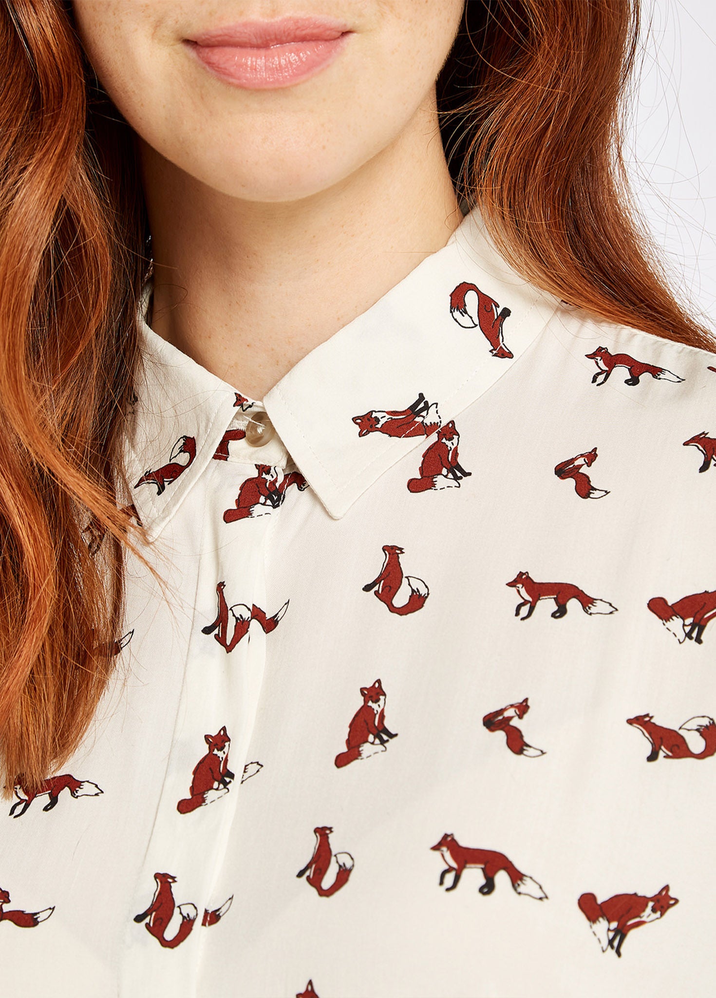 Feel foxy in the uniquely designed Delphine shirt. Made in feminine, flattering rayon fabric it falls beautifully with an spread collar and is printed with a custom Dubarry fox illustration. Comfortable to layer under warming knits or an eye catching match with a Dubarry Juniper tweed gilet.