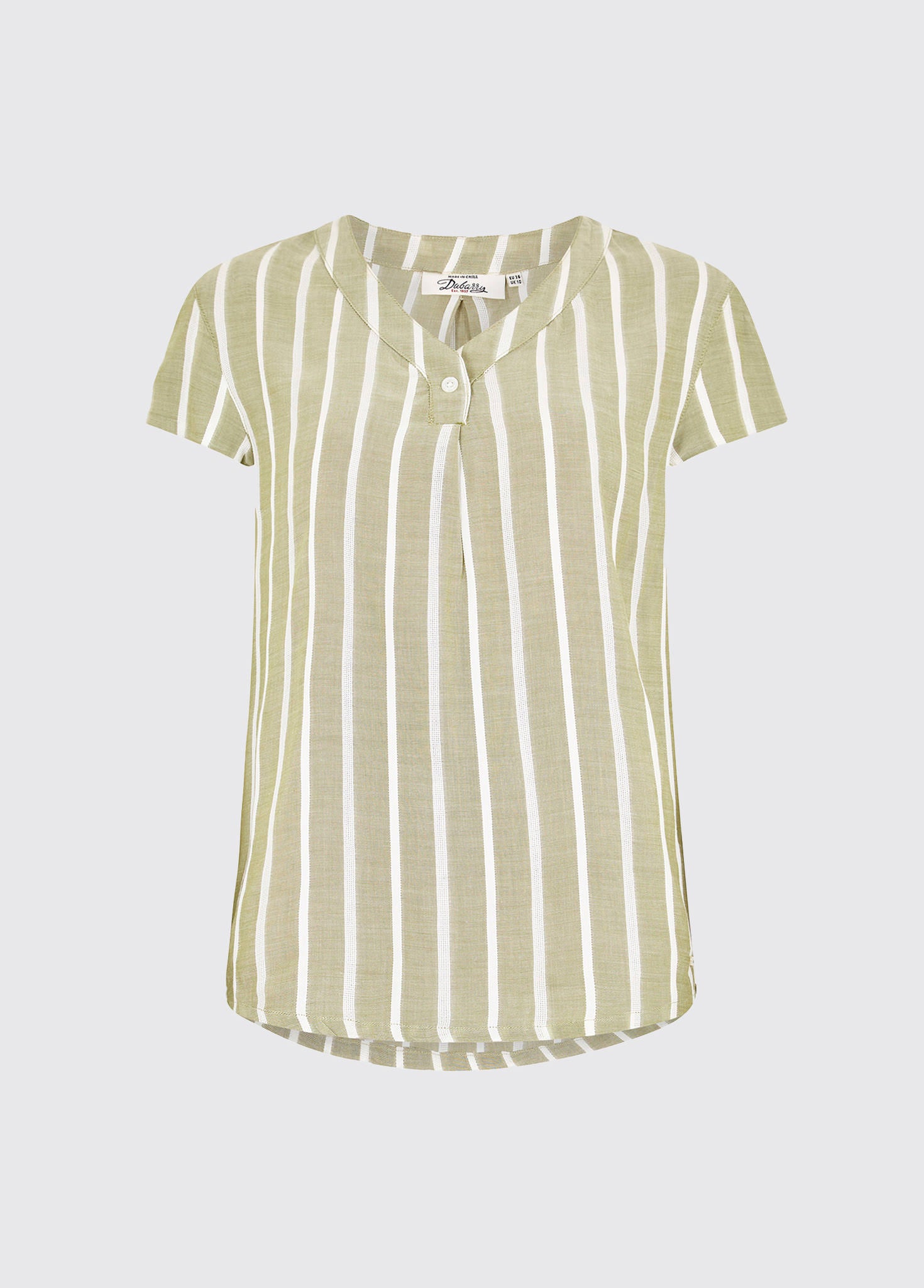 Slightly sheer, vertically striped shirt, which echoes marine and crew clothing no matter where the summer flows. Short sleeves with a Dubarry pearl button detail at the collar, gives this lightweight summer top the finesse for both comfortable city life and easy summer walks along the sea shore.