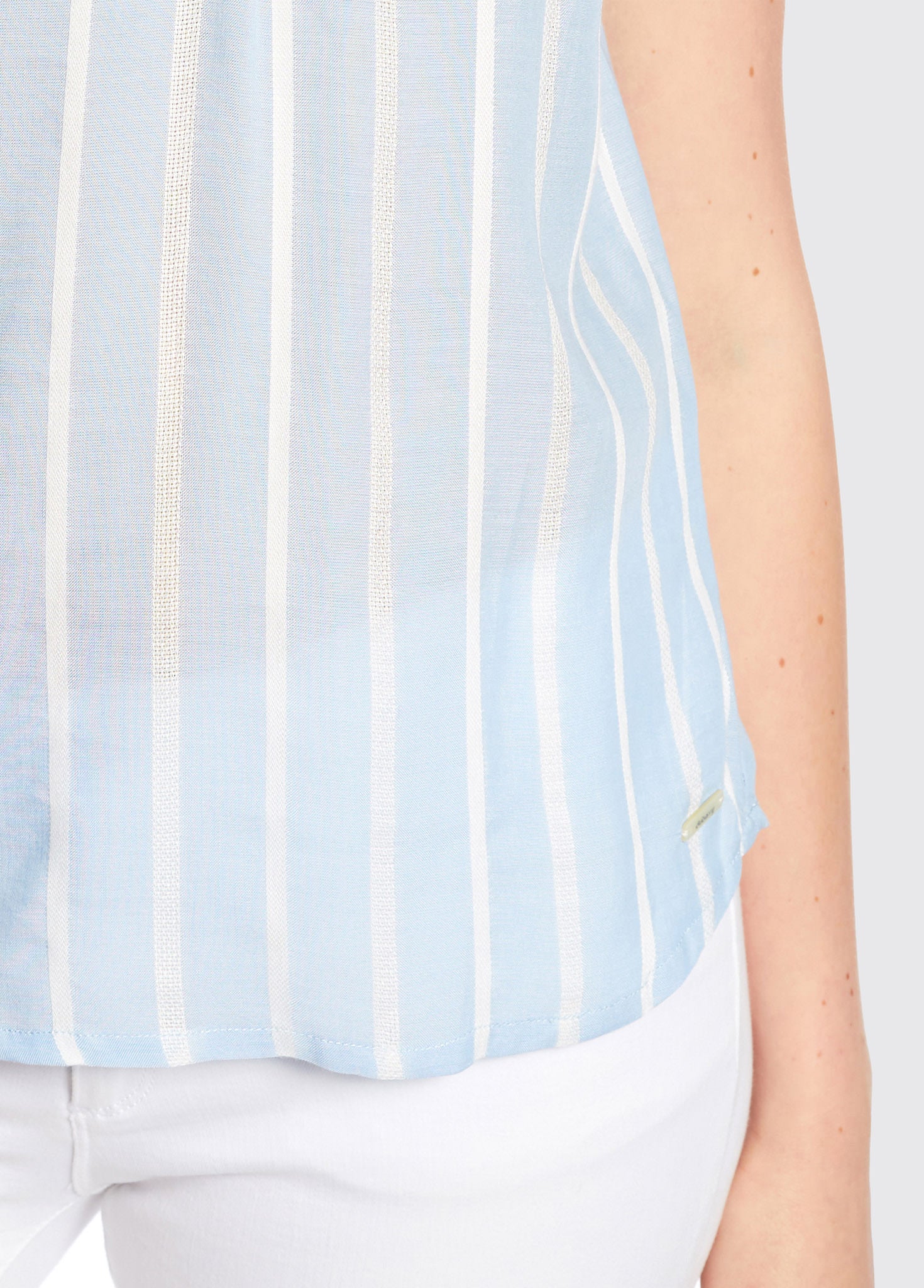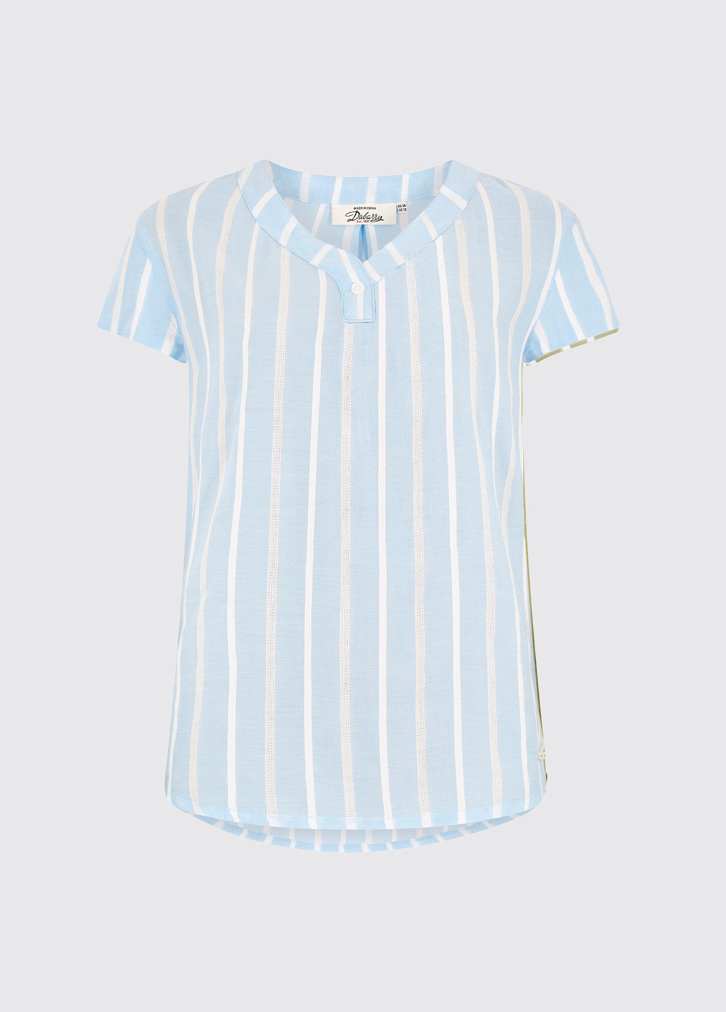 Slightly sheer, vertically striped shirt, which echoes marine and crew clothing no matter where the summer flows. Short sleeves with a Dubarry pearl button detail at the collar, gives this lightweight summer top the finesse for both comfortable city life and easy summer walks along the sea shore.