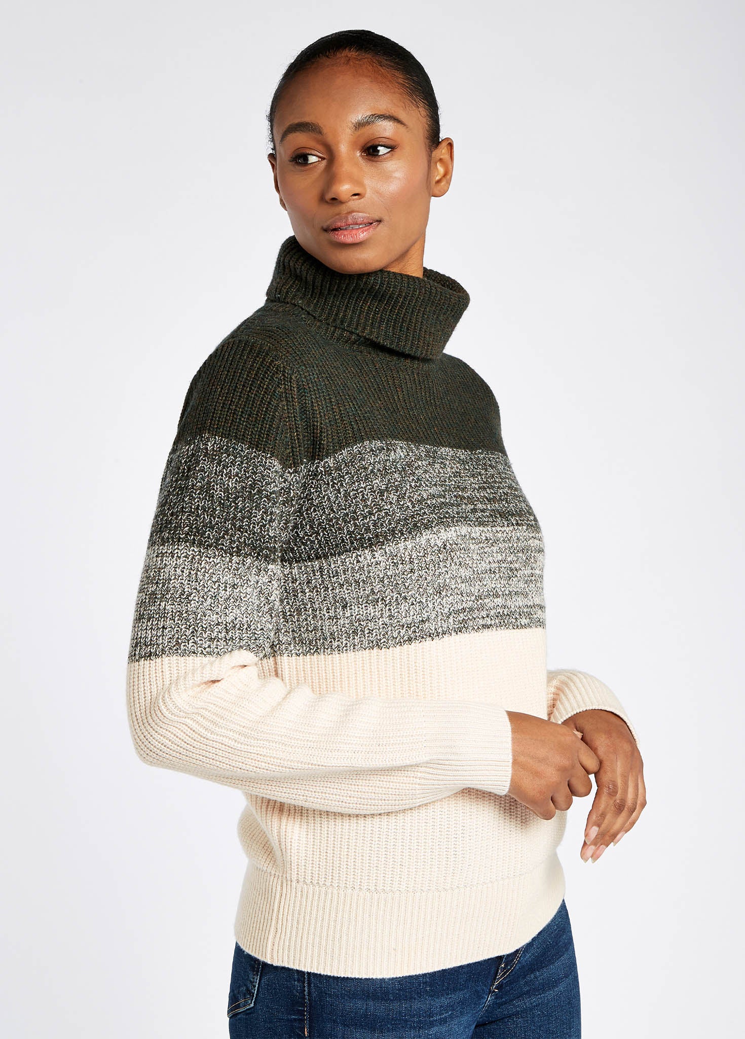 This super soft, luxury wool-mix ladies roll neck is the cosy layer everyone needs in their lives. Pair with jeans and lace up ankle boots for a Scandinavian-inspired laid back look, or if you want something a little dressier, wear the Killossery with a black satin-style midi skirt and heeled boots!