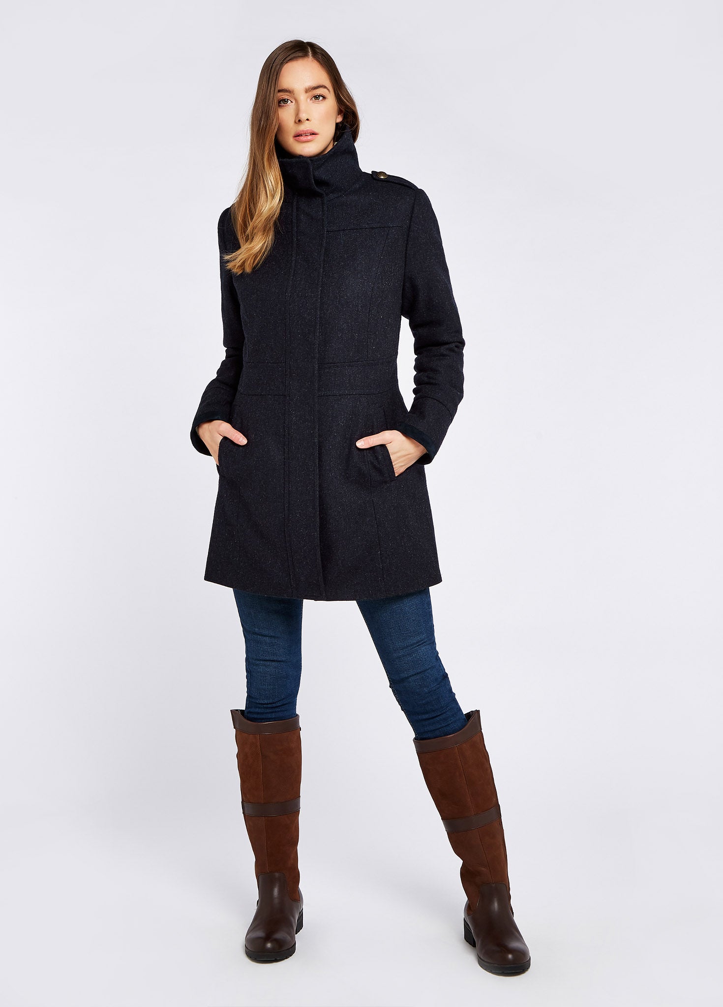 Combining classic tweed elegance with a hint of military influence, the hedgerow fitted coat is a modern wardrobe staple. Buttoned epaulettes give a crisp outline and the high collar guards against the elements while adding to the eye-catching silhouette.
