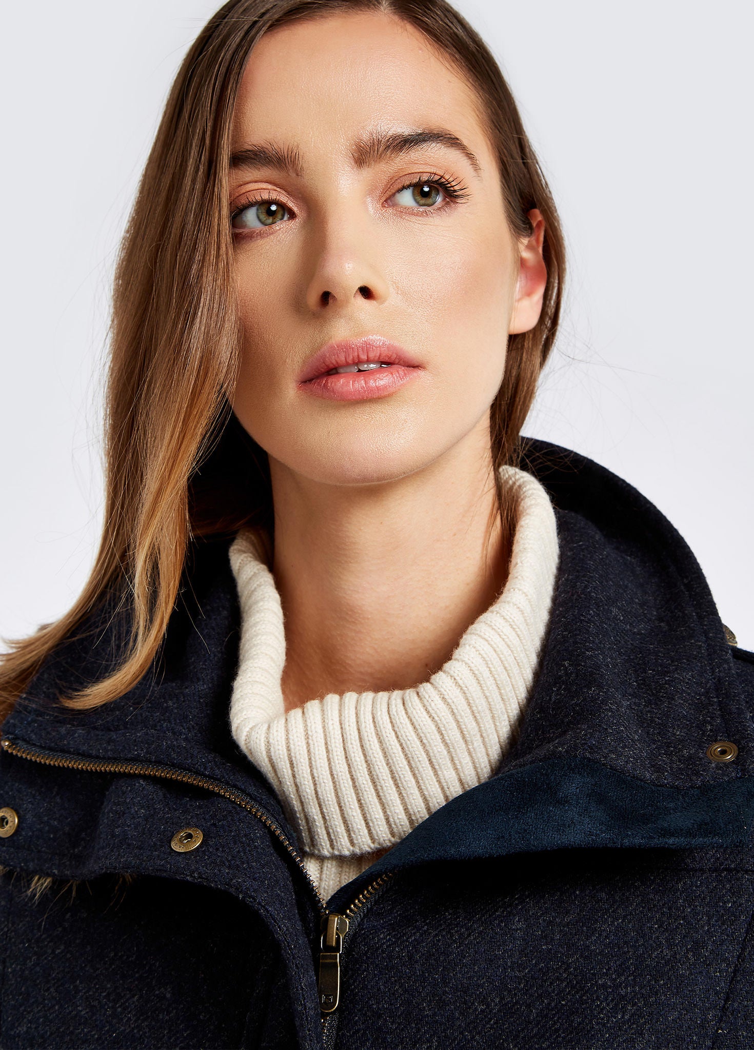 - Structured silhouette with high standing collar