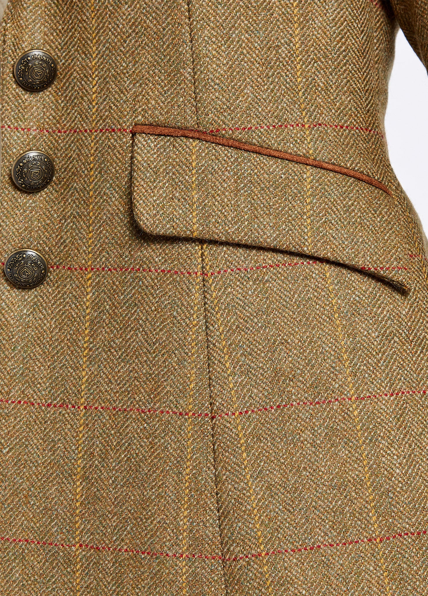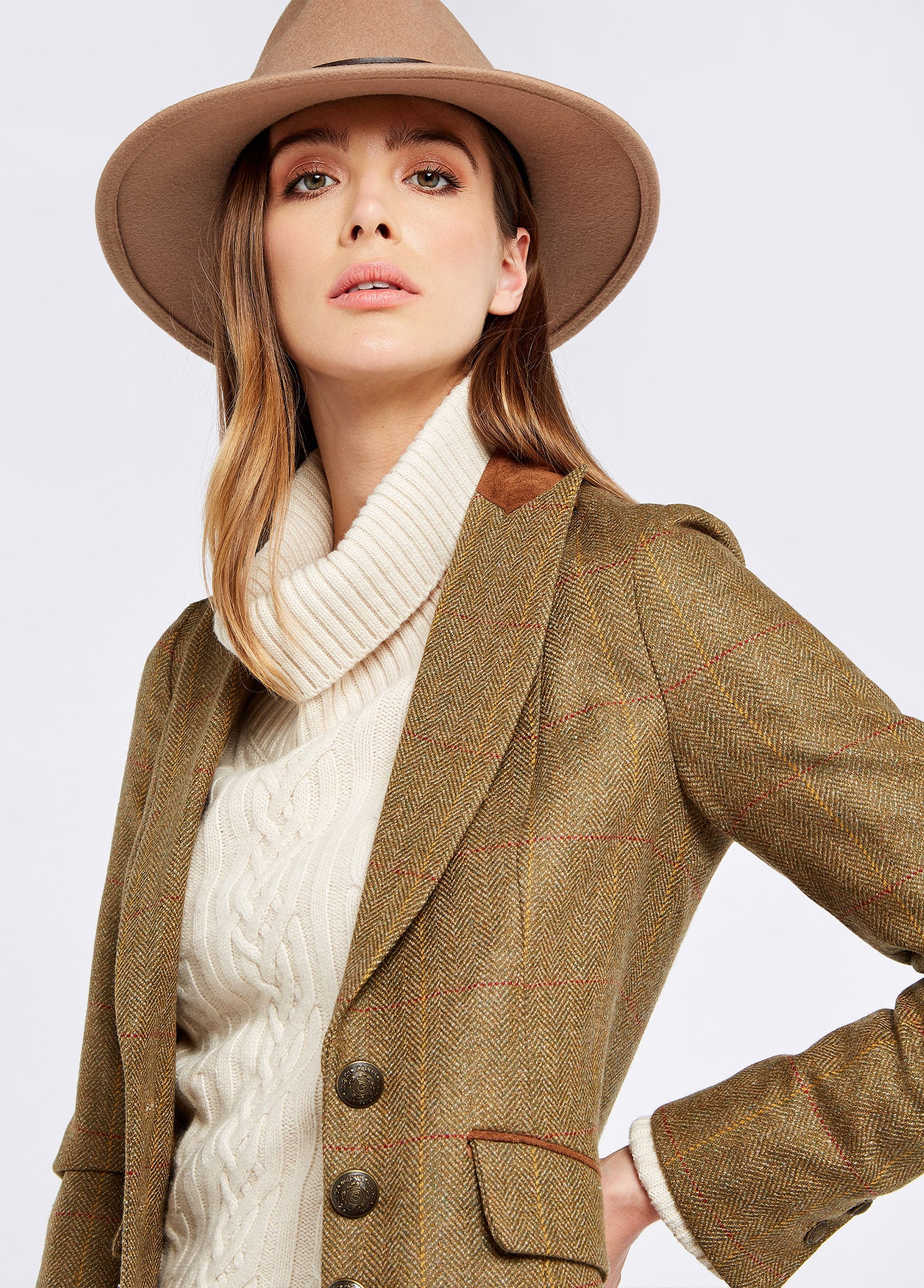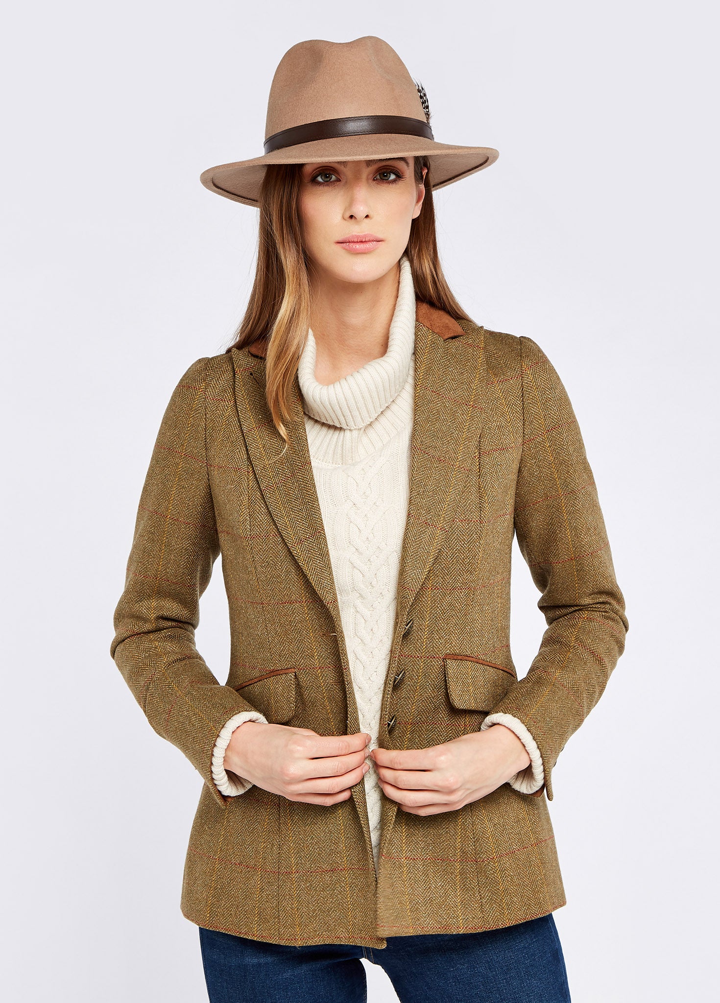 Dubarry women's Heather Tweed Elm Coat. A three button fit and flare hacking jacket with contrasting collar and cuffs.