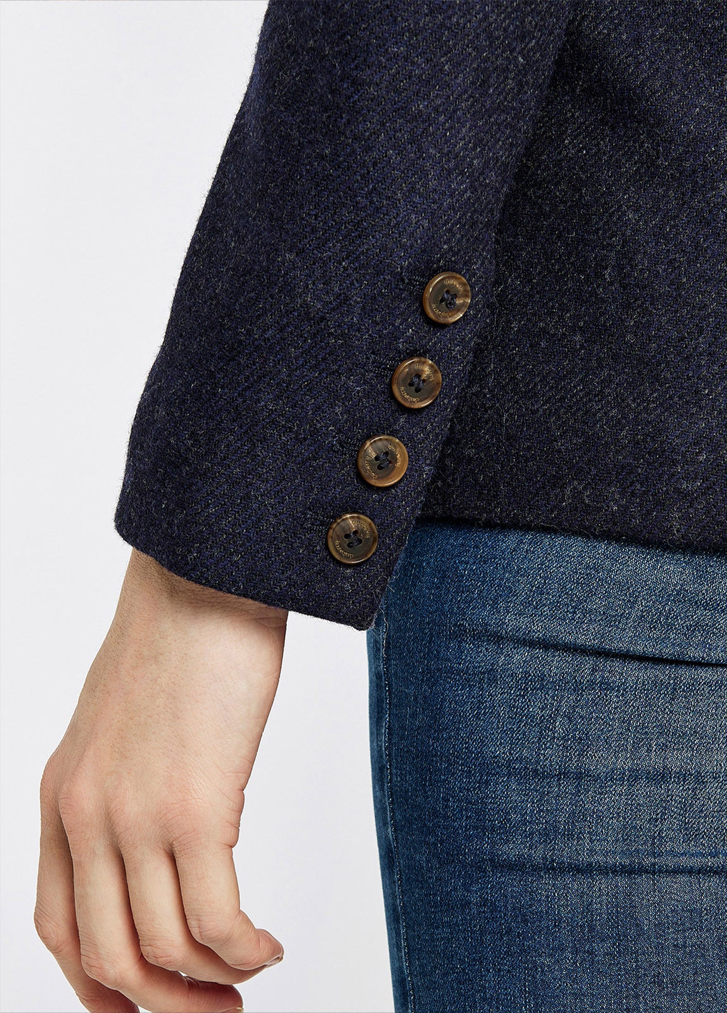 - Faux tortoise shell buttons with subtle branding