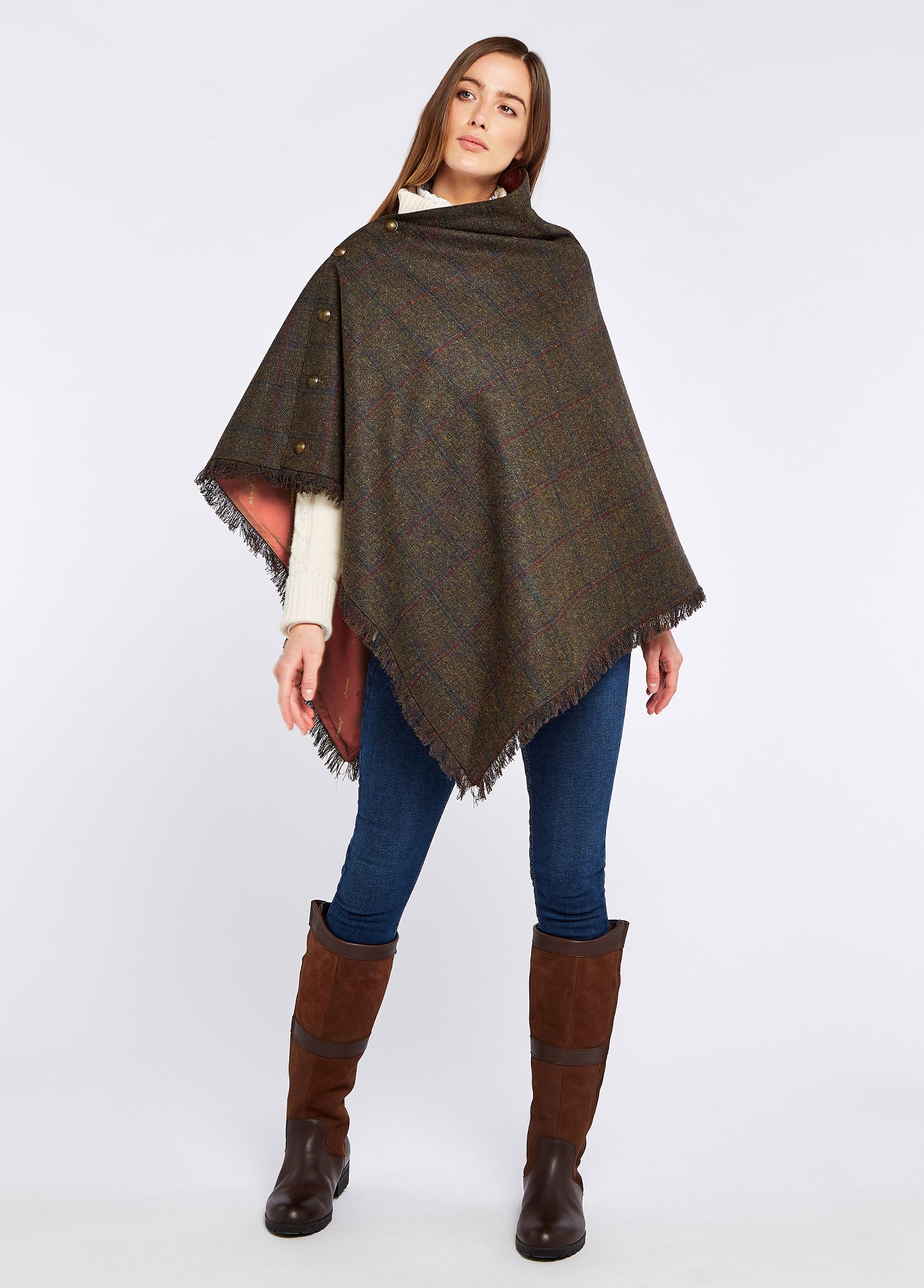 The tweed that should be in every woman's wardrobe. Dubarry's Hazelwood poncho is a super versatile and comfortable piece which you will find yourself in again and again. Cosy Teflon® coated 100% Pure New Wool drapes elegantly and fastened to one side with smart brass coloured buttons. The one-size-fits-most relaxed style feels as at home at the races as in town or the local pub.