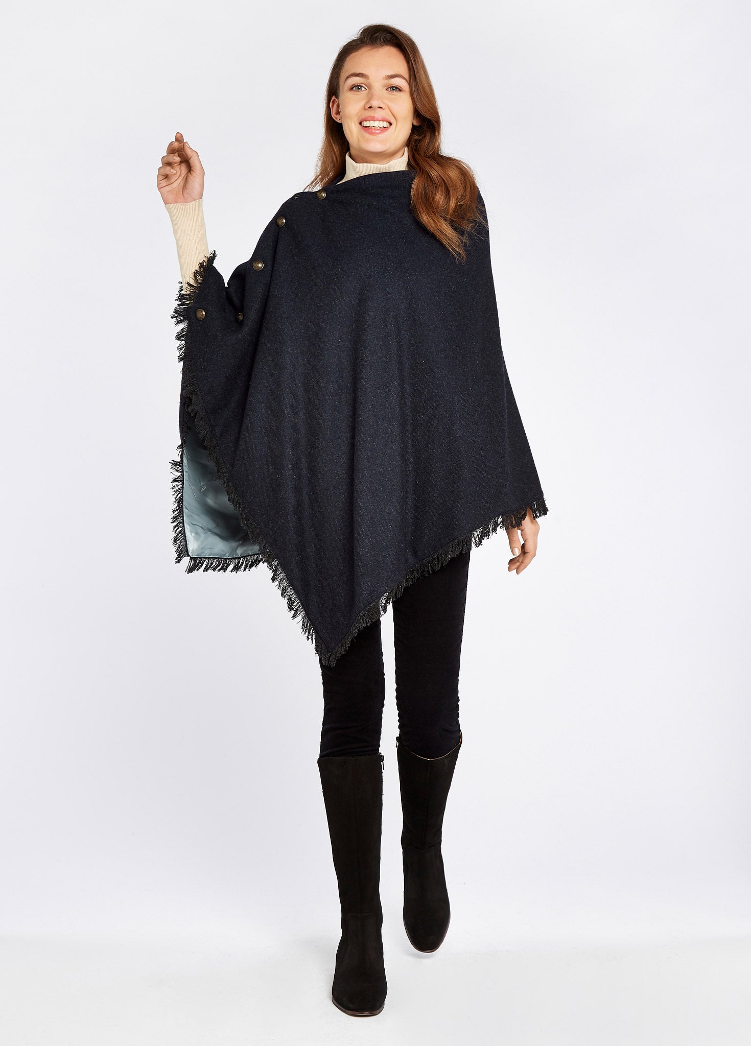 The Hazelwood Tweed Poncho is a must-have piece for every woman's wardrobe. Made from pure new, this super versatile and comfortable poncho is perfect for any occasion. The relaxed fit and elegant draping of the poncho, fastened with smart brass-coloured buttons, make it a perfect fit for everything from a day at the races to a casual night out at the local pub. You will find yourself reaching for this poncho again and again, thanks to its elegant and versatile design.