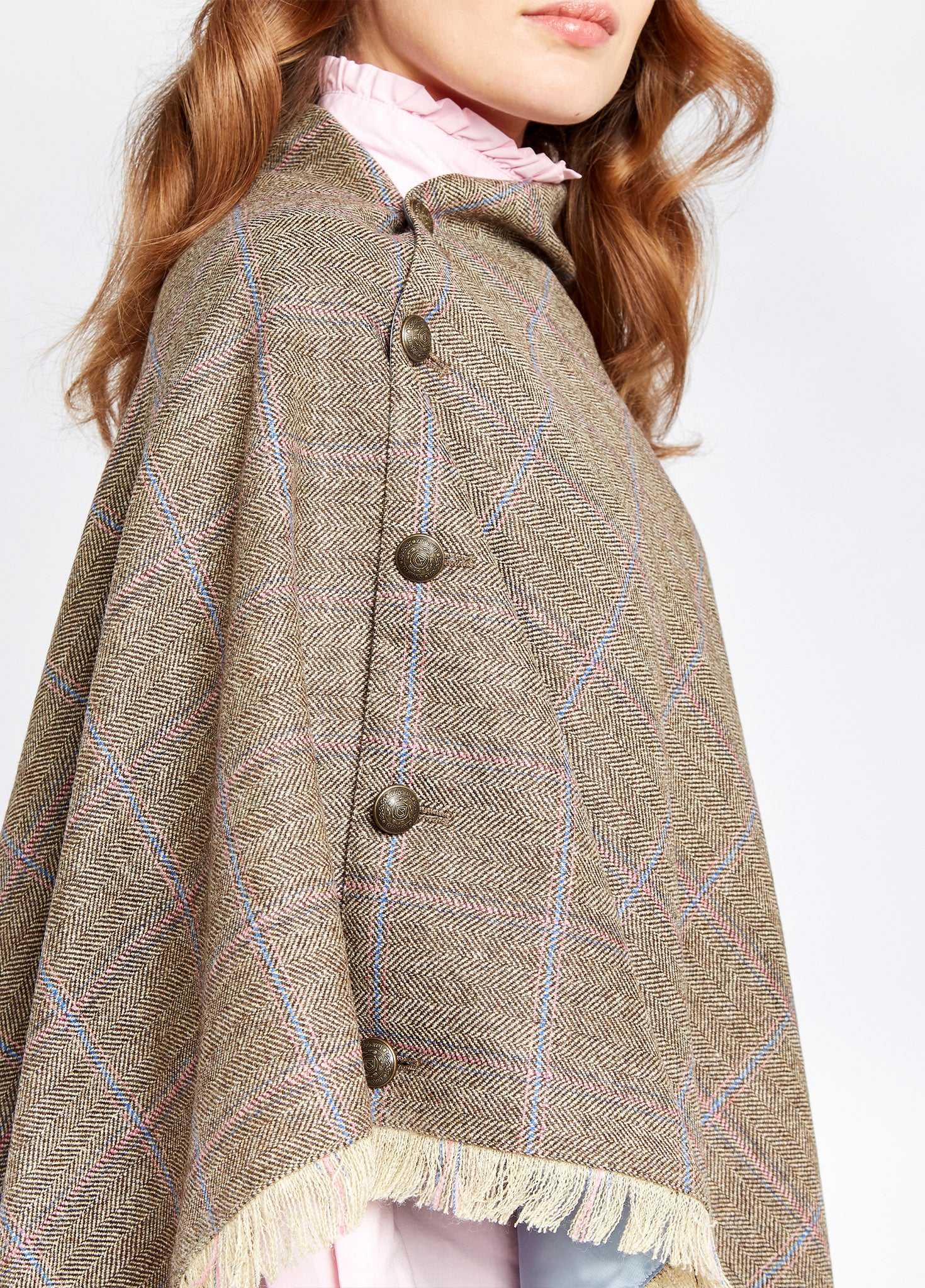 The tweed that should be in every Woman's wardrobe. Dubarry's Hazelwood poncho is a super versatile and comfortable piece which you will find yourself in again and again. Cosy Teflon coated 100% wool drapes elegantly, fastened to one side with smart brass coloured buttons and the one-size-fits-all relaxed style feels as at home at the races as in town or the local pub. A relaxed fit tweed poncho.