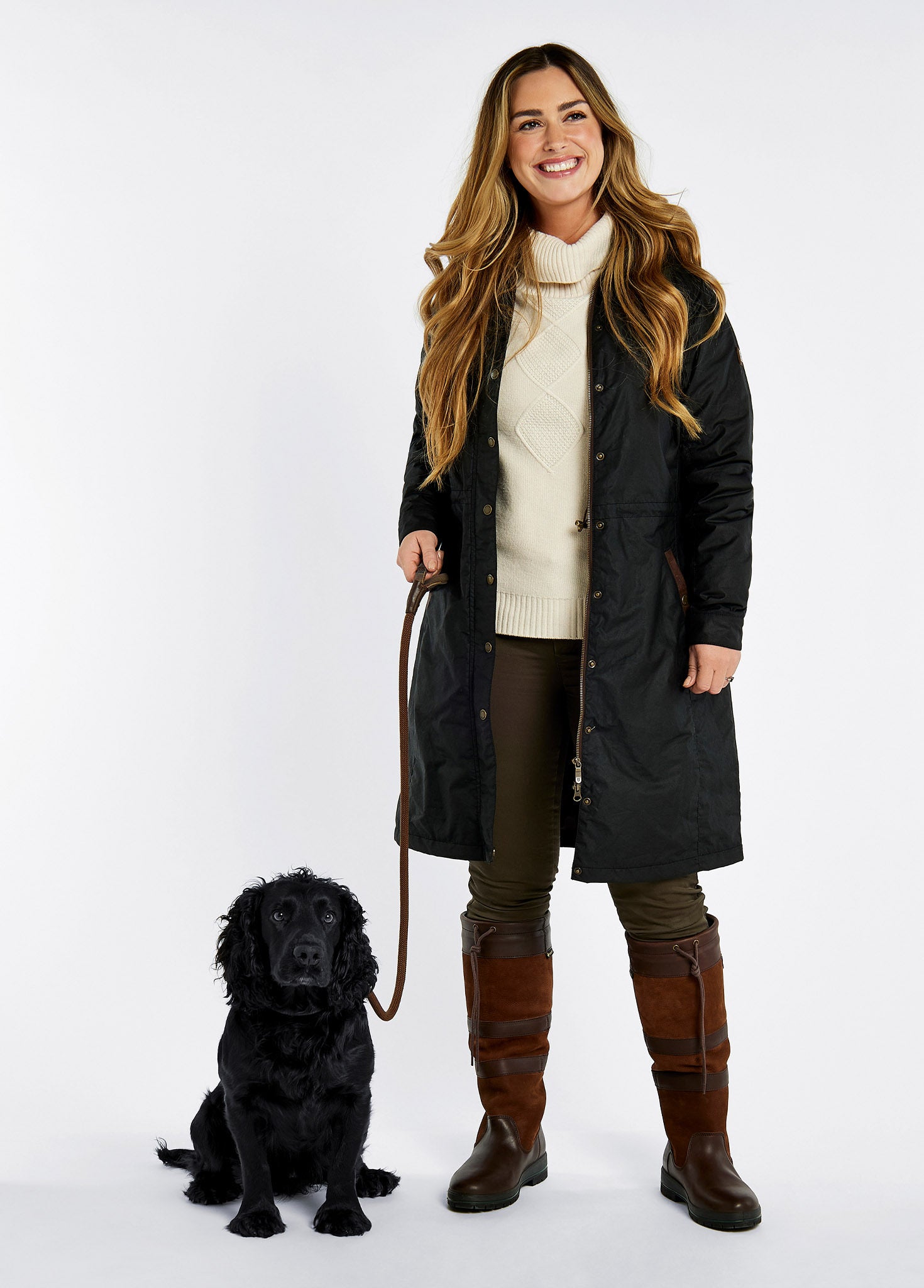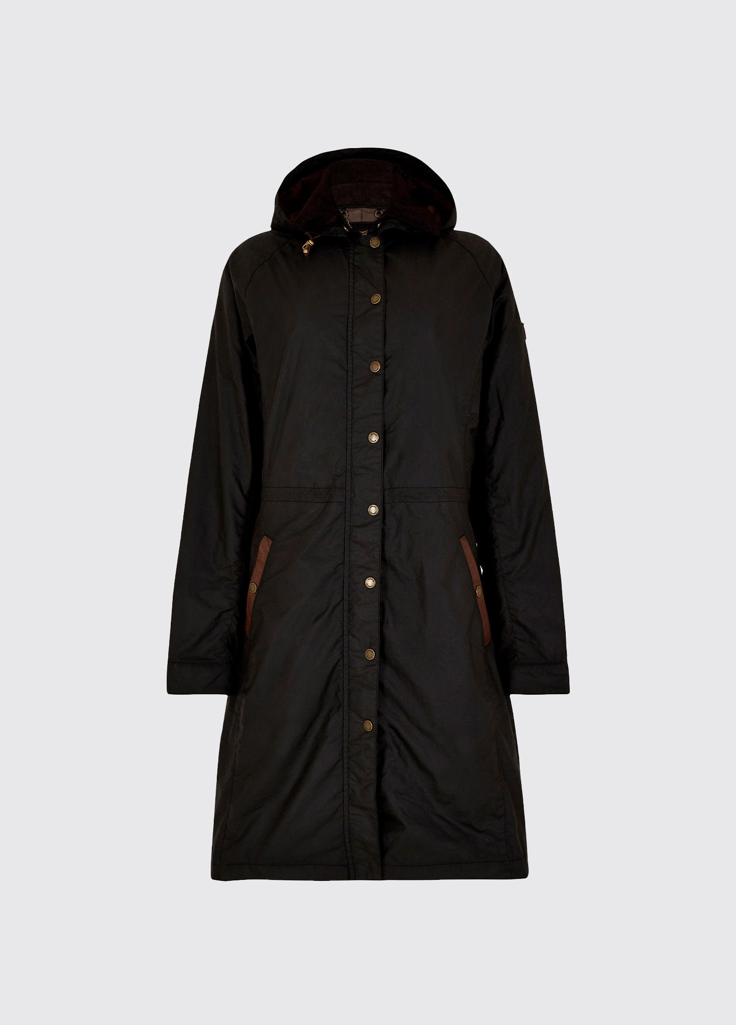 A black Dubarry Redington Wax coat, longer length coat with  full zip. Model is wearing a light coloured jumper underneath.