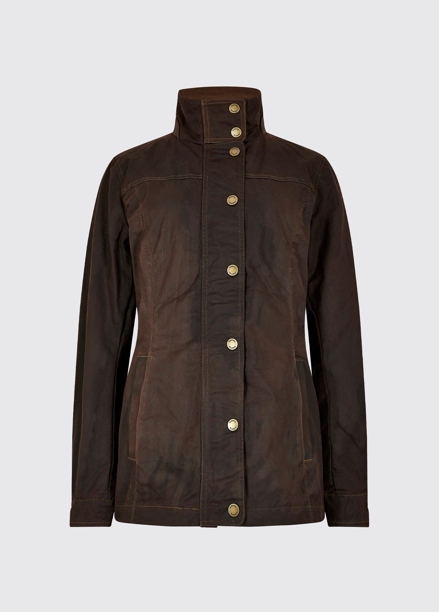 The Mountrath ladies waxed jacket is a winter jacket that stands out with its unique features. Made with waxed cotton, this jacket has a water-repellent finish and PrimaLoft® filling, making it perfect for cold and wet weather. The leather trim and branded stud poppers add a touch of elegance, while the faux suede collar and gently tailored shape give it an urban edge. The leather collar tab facing and sleeve placket add to the overall durability and functionality of the jacket.