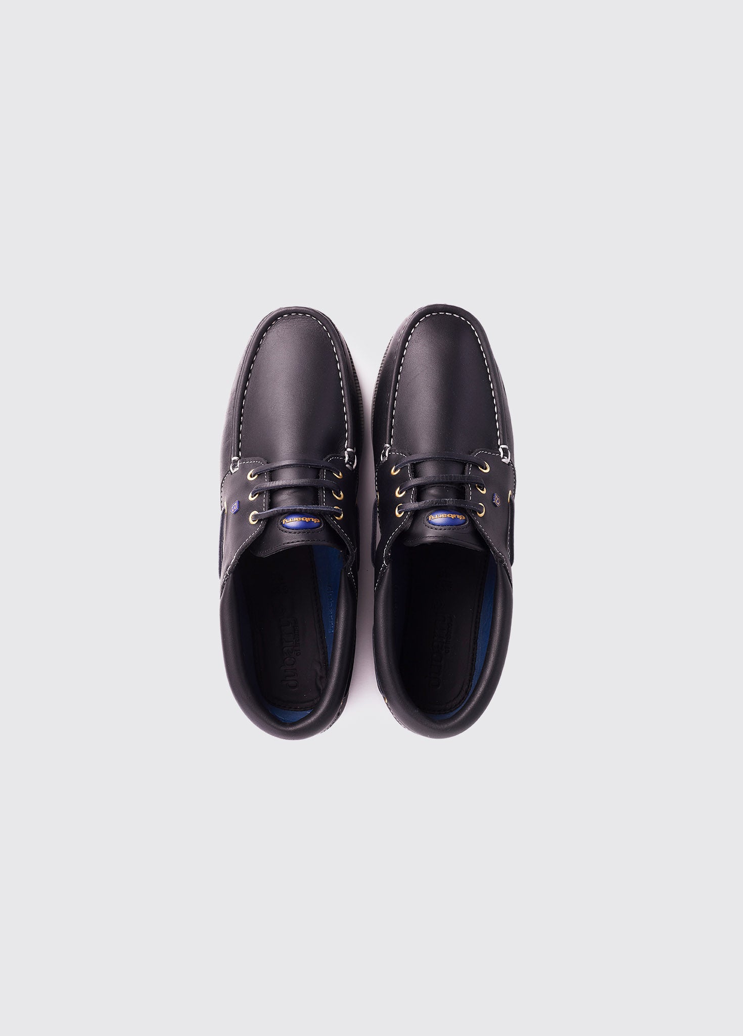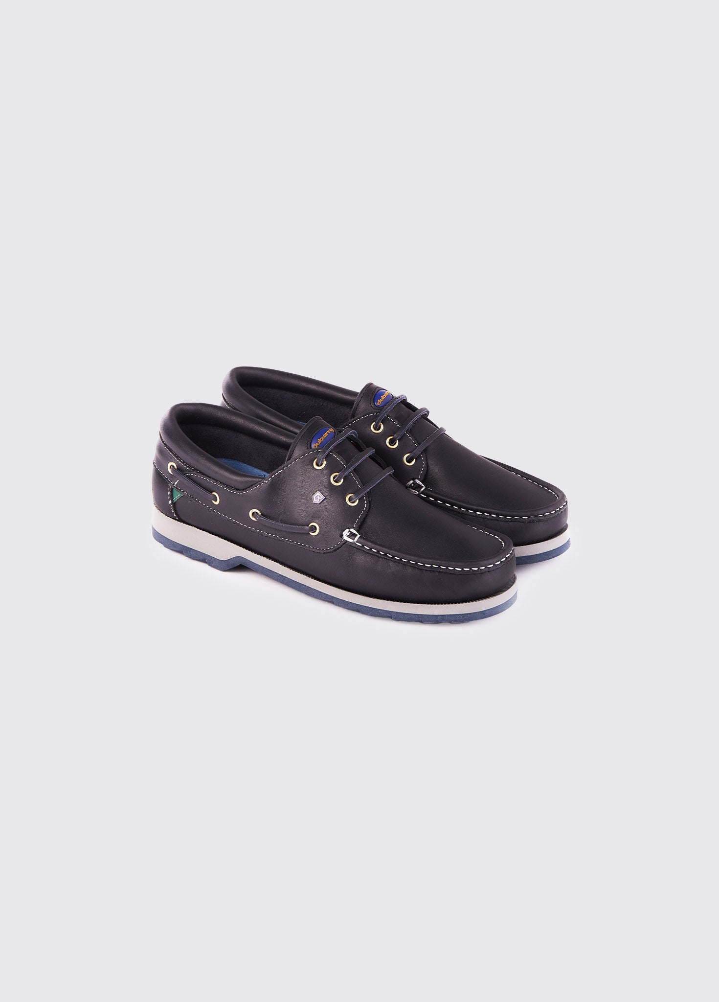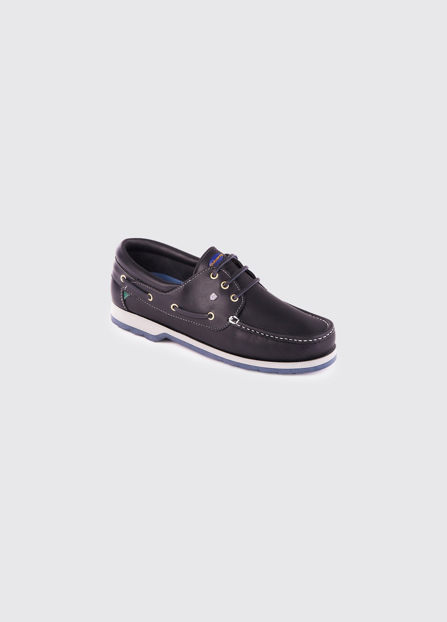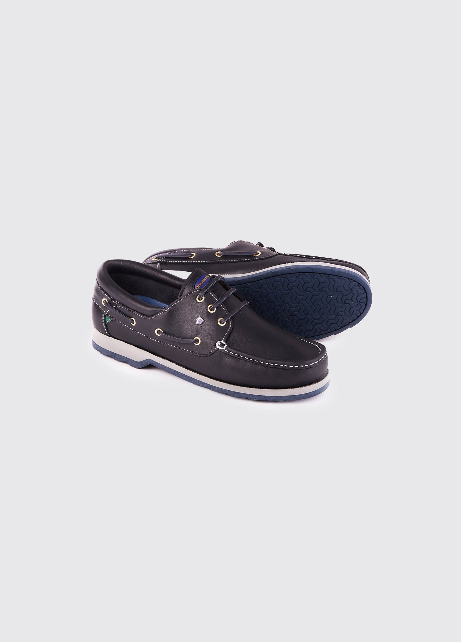 The Commander deck shoe is made with soft leather or nubuck, both protected with a water resistant finish and fastened with three eyelet leather laces which are adjustable around the foot for a snug, secure fit. Designed for comfort and performance on board, they combine a padded collar around the ankle and a soft pad under foot with non-slipping soles and rust-proof points. With an two colour sole option they look as good on the shore as at sea teamed with shorts, jeans or chinos and Dubarry Claremorris polo shirt.
