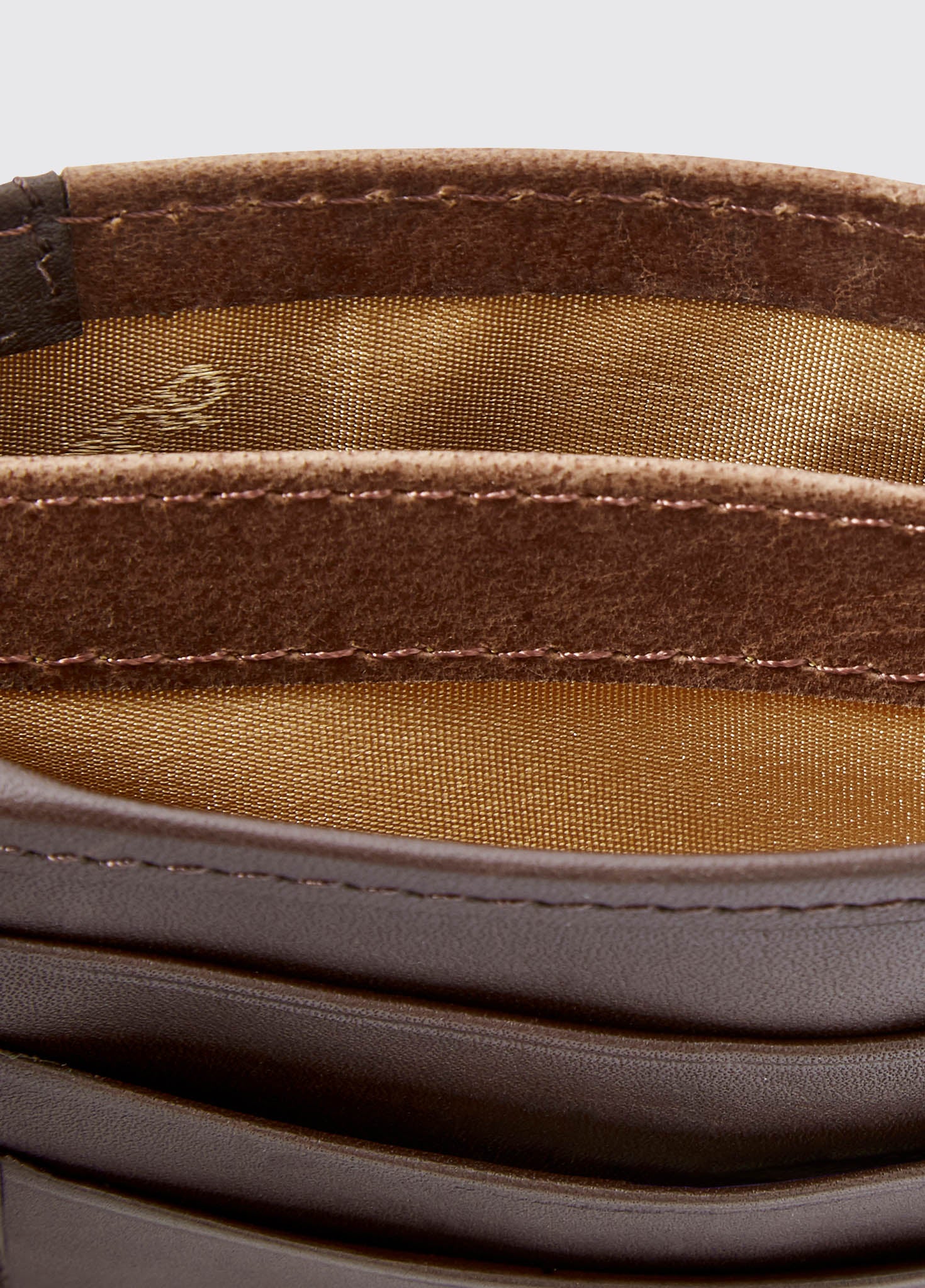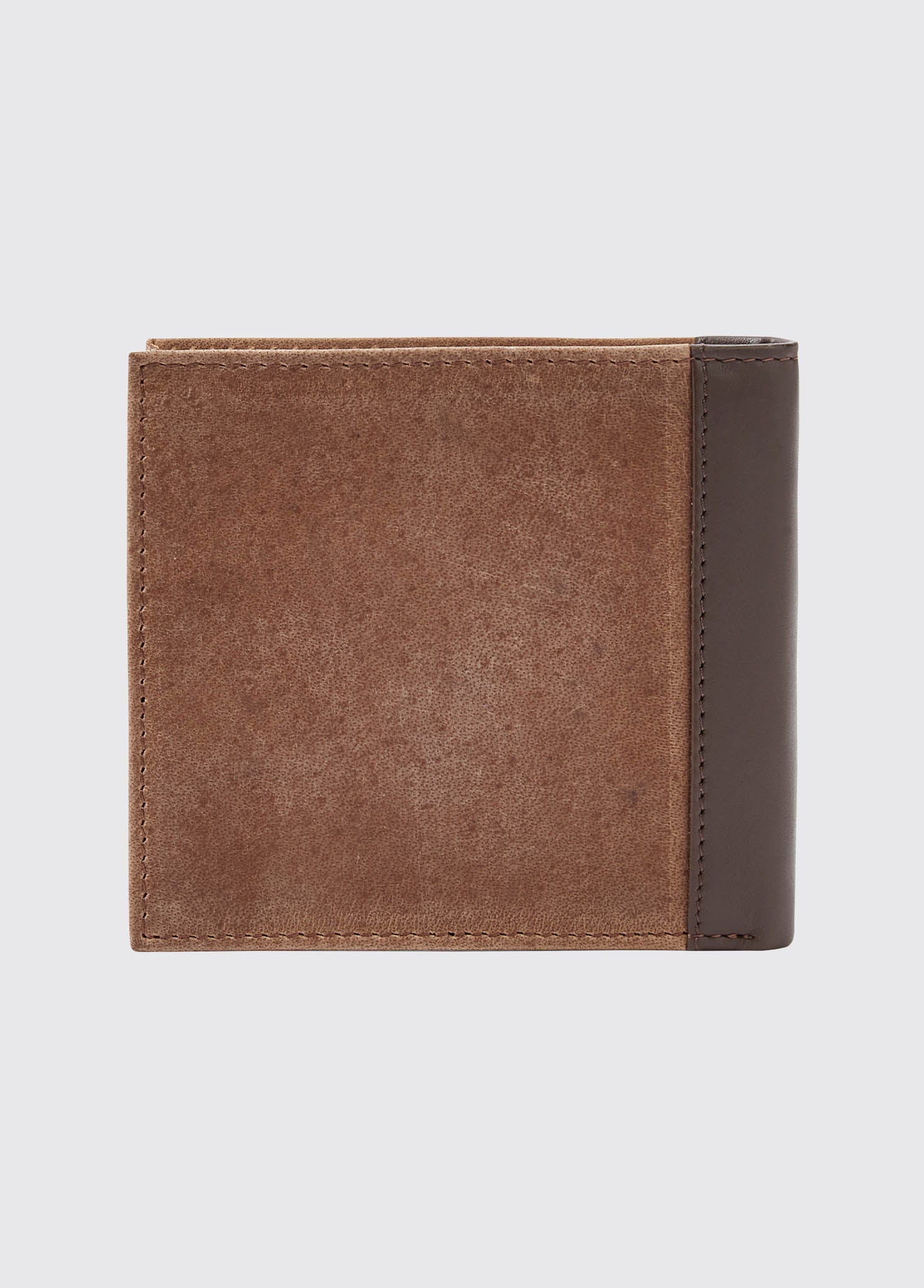 Men's leather wallet with a water resistant finish. Six credit card slots and four pouch pockets plus RFID-blocking lining.