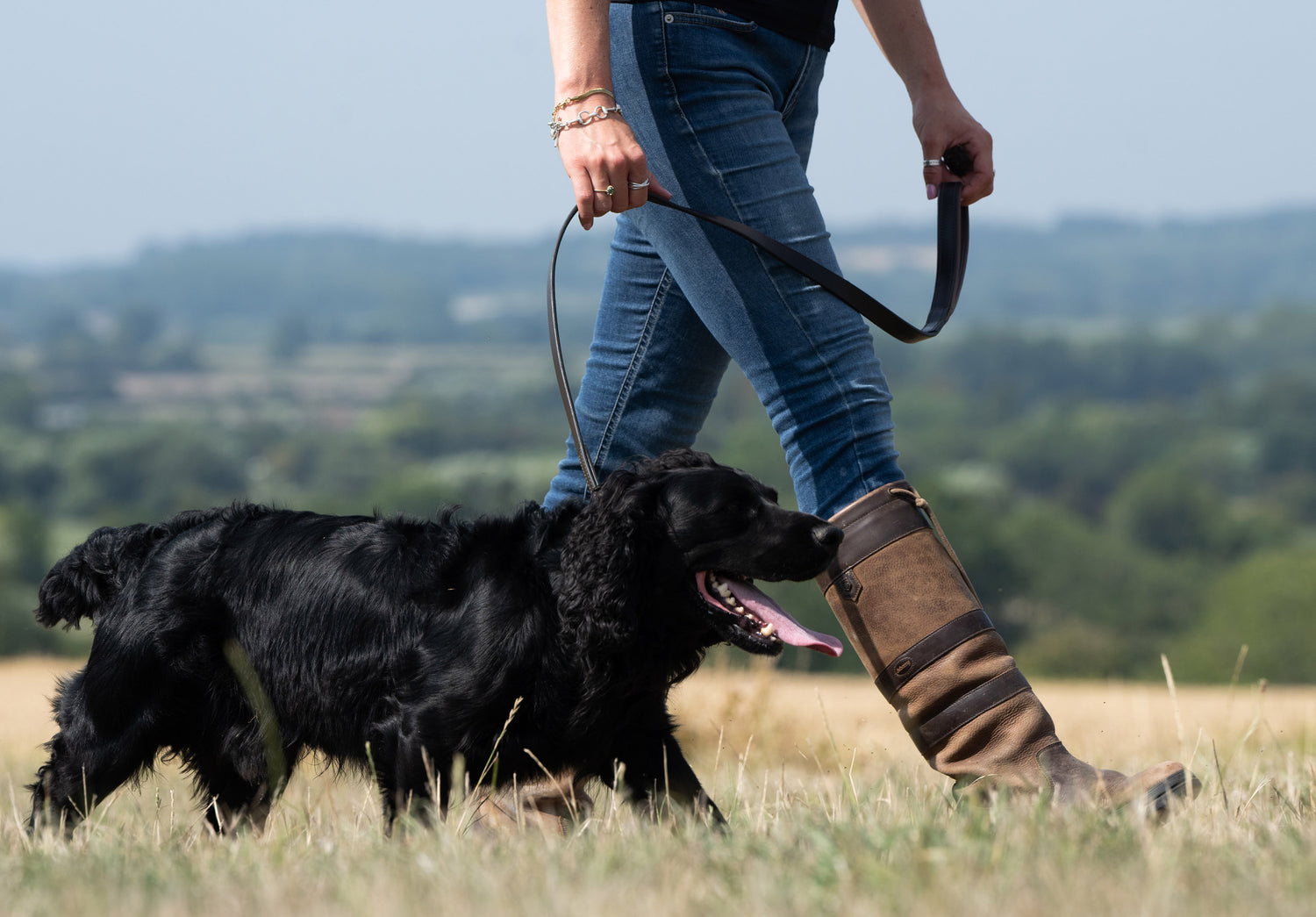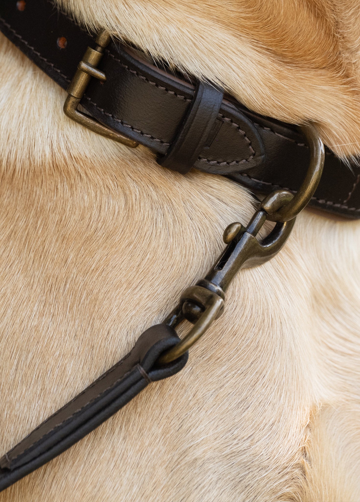 A durable hand stitched leather lead that gives a real quality appearance and matches our Axel leather dog collar. Fastened with a solid antiqued brass metal clip and with padded handle. Measures 3'9".