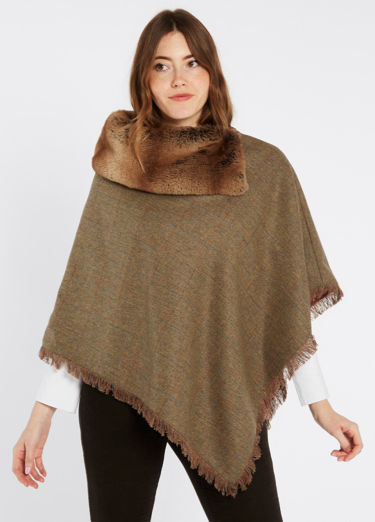 Silverfir women's tweed poncho with faux fur collar in Burren