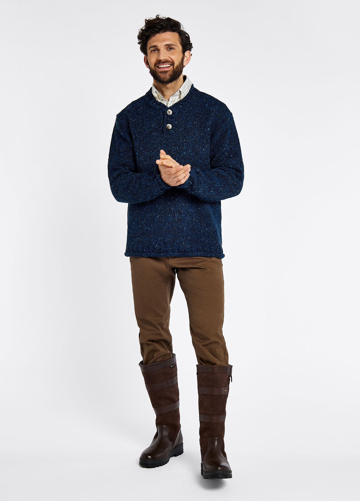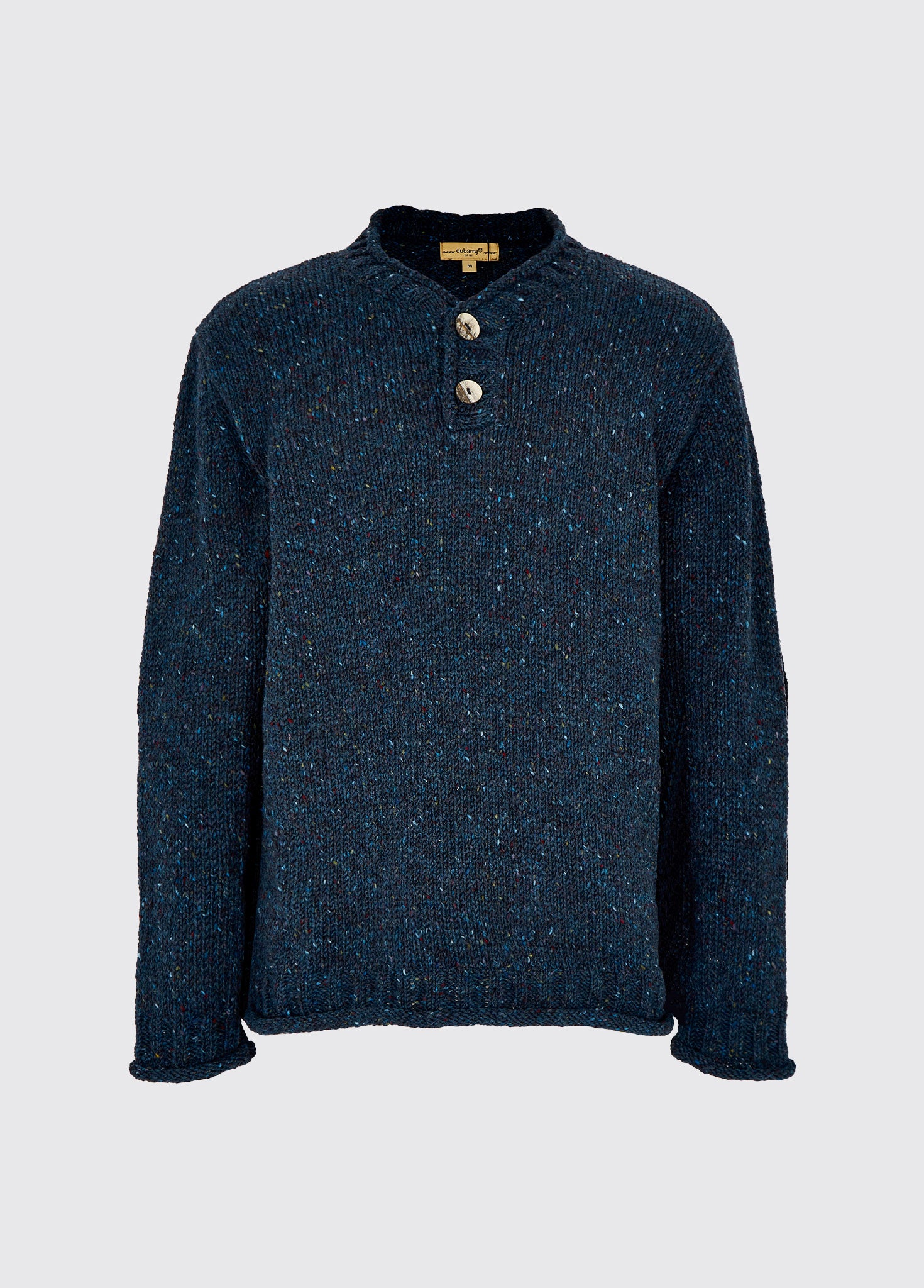 A showpiece of beautiful Irish workmanship, the yarn for this rugged sweater was spun in Donegal and shows distinctive flecks throughout the wool. The v-neck, with a wide rib trim and rolled neckline has classic horn button fastenings giving it a quality, traditional feel. A real eye-catching garment it's perfect weekend away packing, or layer up under a waxed jacket for a winning combination in the wildest of weather.